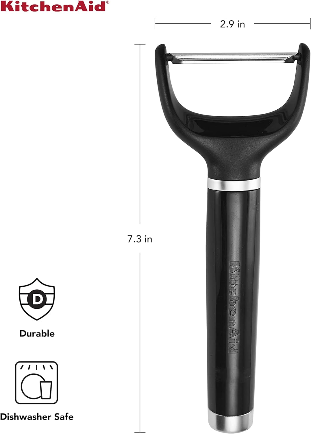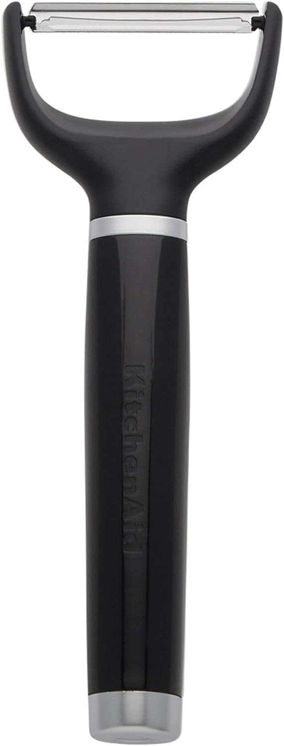The KitchenAid Y peeler is a sleek and stylish design that makes peeling fruits and vegetables simple. This Y peeler features a single edge straight blade constructed of tough, rust-resistant 420 stainless steel. The peeler’s ergonomic handle provides a sure, comfortable grip when in use. The glossy ABS handle features a debossed logo, as well as an ABS satin chrome plated bolster and endcap. The Y peeler is completely dishwasher safe for easy cleanup and comes with a protective sheath for storage. One year hassle-free replacement and lifetime limited .