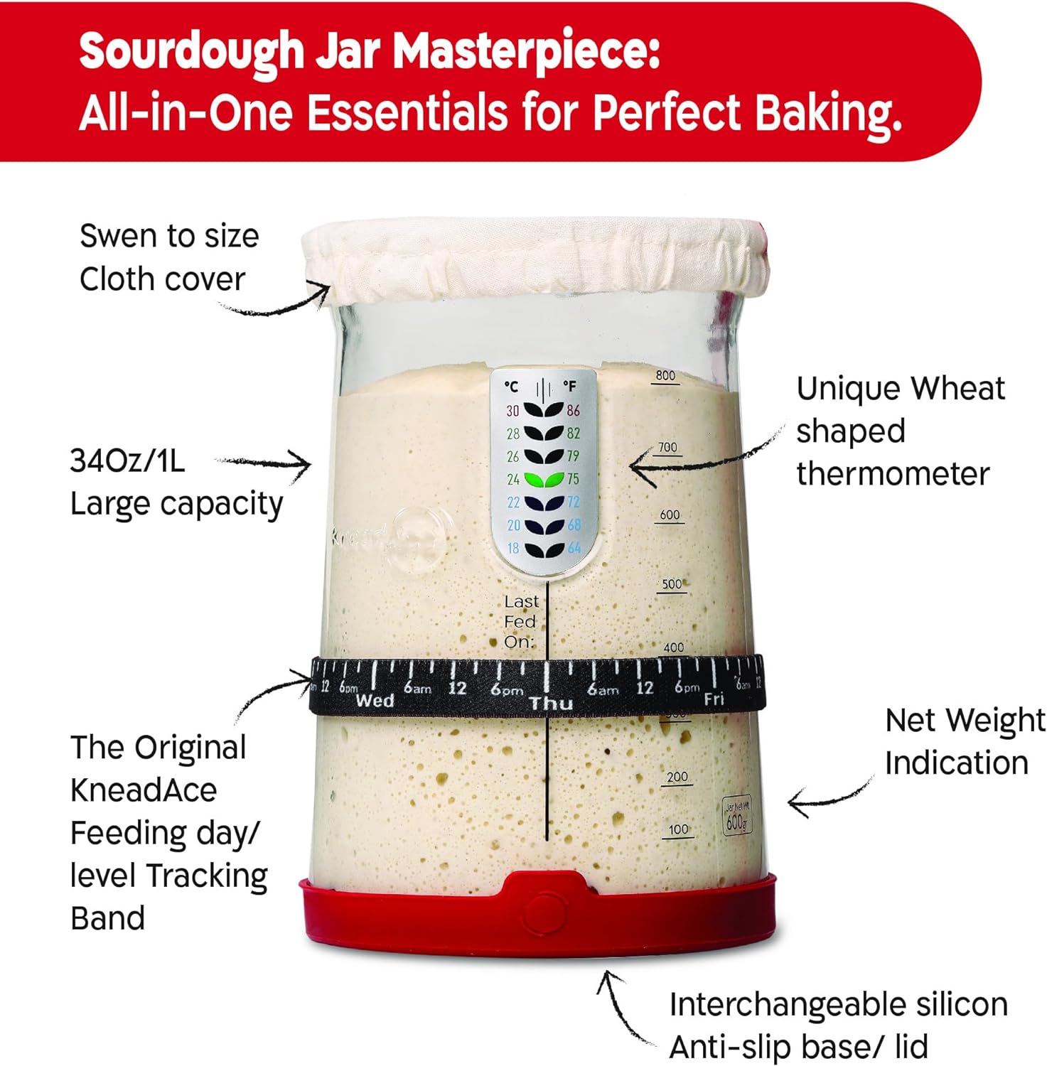 Essential Addition To Your Bread Making Tools & Supplies – This sourdough jar kit comes complete with volume, net weight & feed line marks, thermometer, cloth cover, silicone cover/base & spatula.