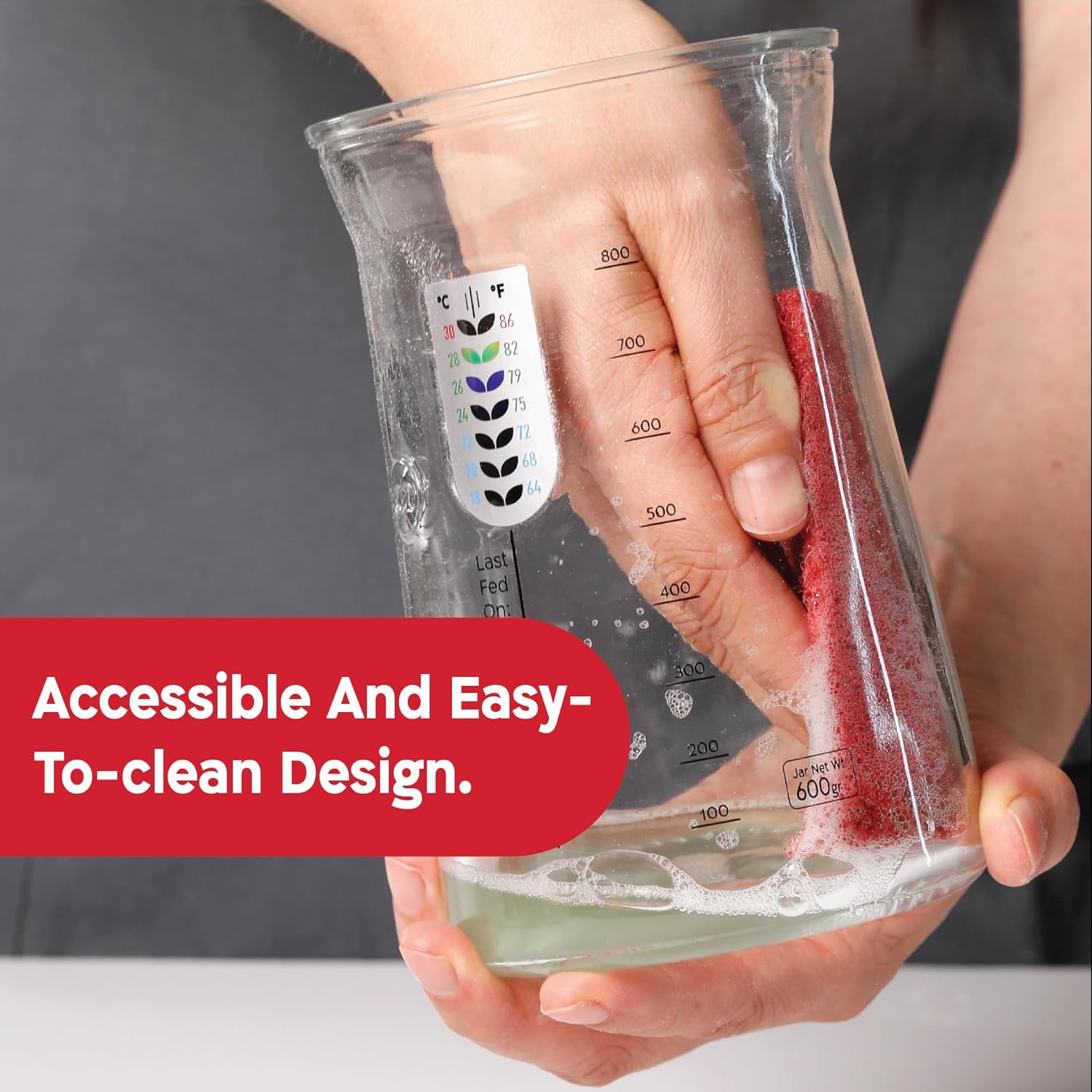 Discover the Joy of Artisan Sourdough Bread – Exclusive design, molded for optimal sourdough starter maintenance. With its funnel-shaped opening, this sourdough starter jar enables effortless handling.