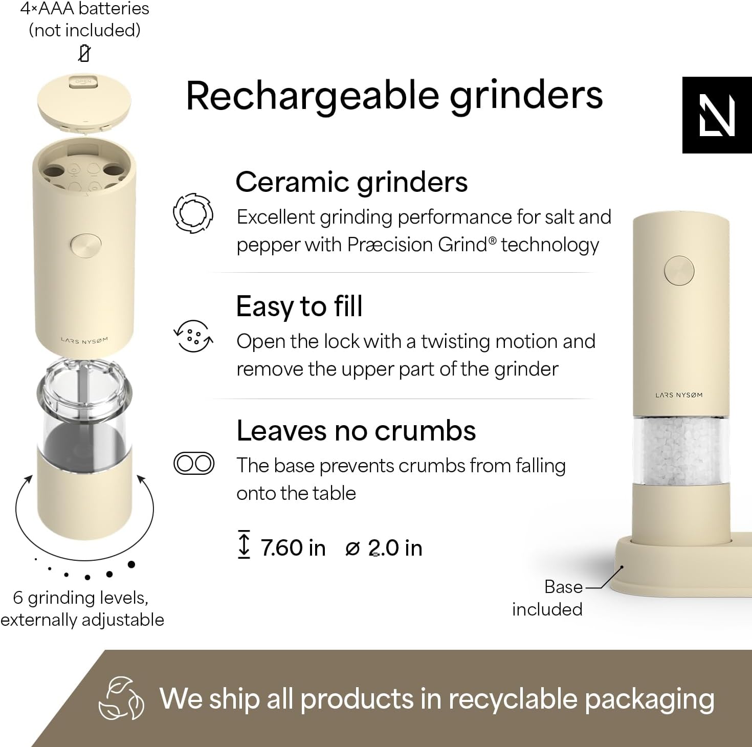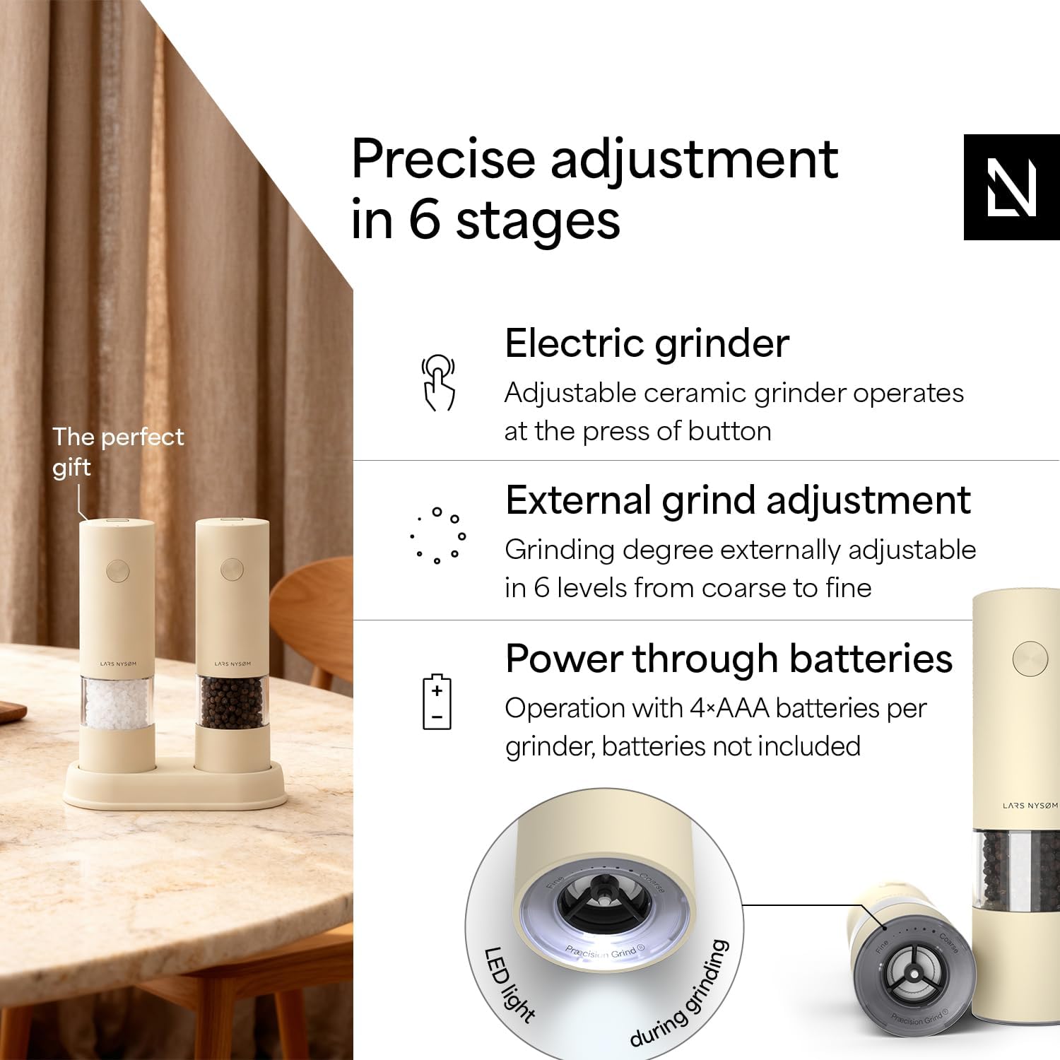 LARS NYSØM Electric Salt and Pepper Grinder Set I Automatic Salt and Pepper Mills with Adjustable Ceramic Grinder I AAA-Battery Operated Electric Spice Mill Set (Almond Beige)