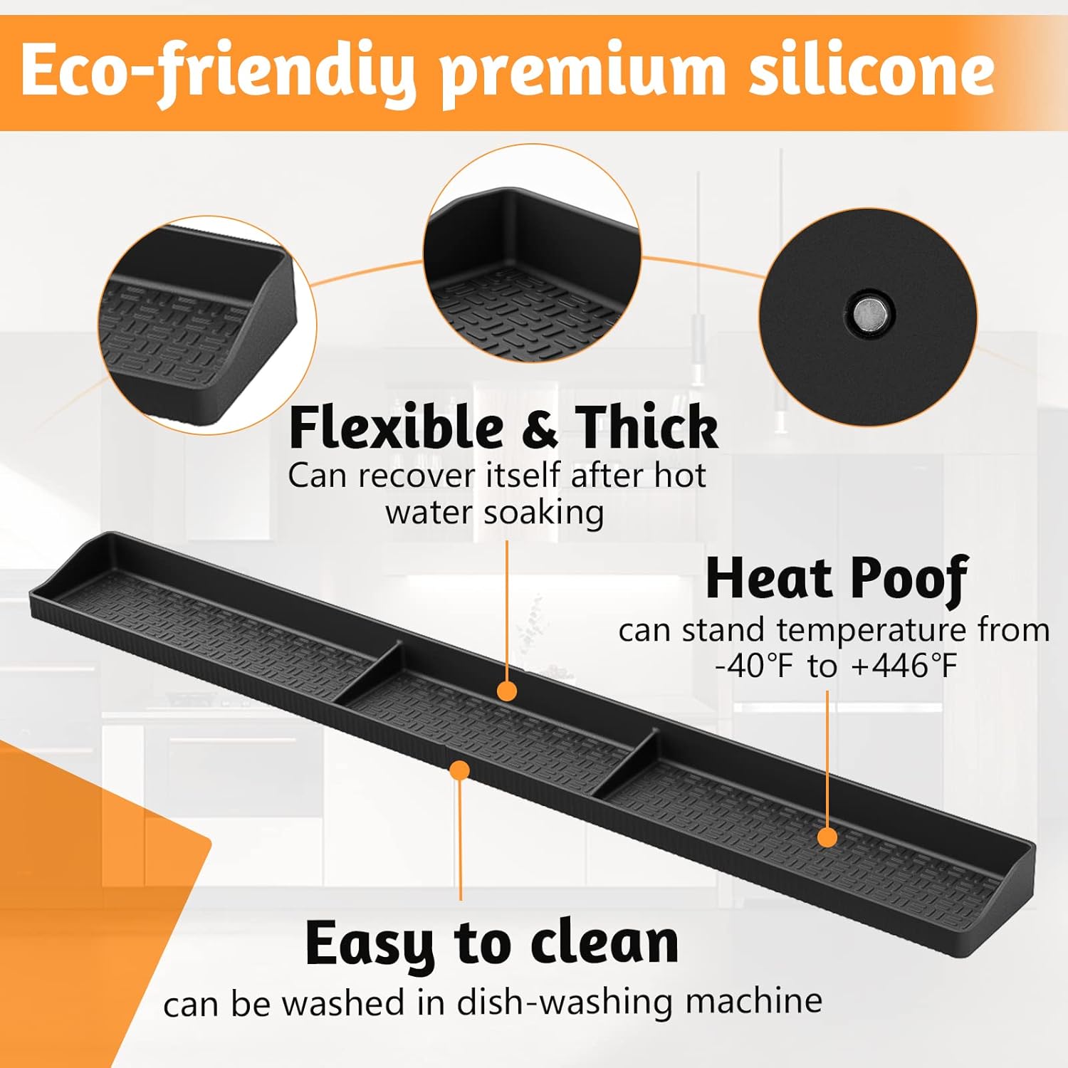 HEAT-RESISTANT & SAFE, PREMIUM MATERIAL: Made from food-grade silicone, it withstands temperatures from -40°F to 446°F. The surface stays cool to the touch, ensuring the safety of items on your stove top spice rack.