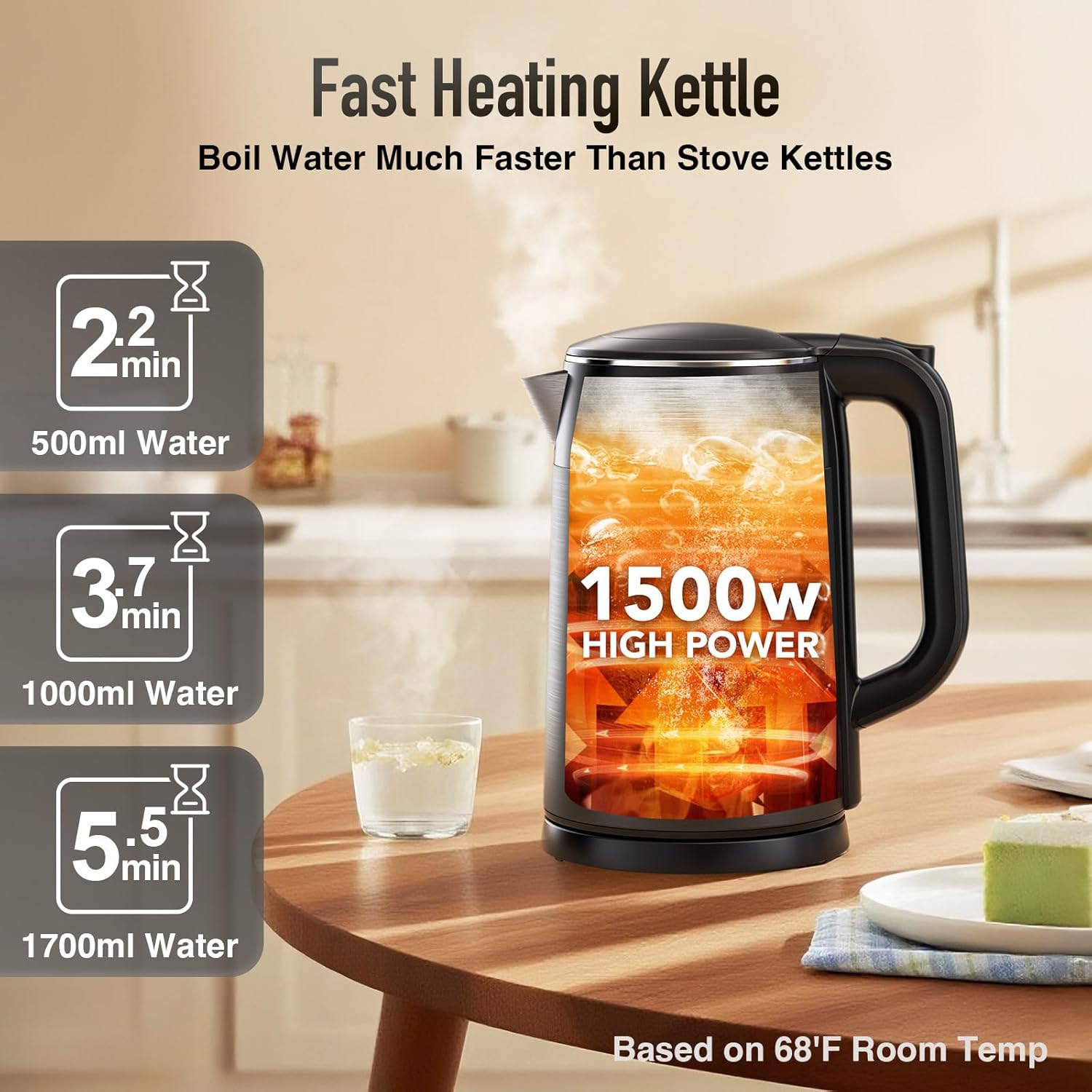 【1500 W Fast-Boil Technology – Ready in Minutes】High-powered 1500 W heating element, boils water in 3 minutes for tea, hot chocolate, coffee and more. Full kettle ready in under 6 minutes—significantly faster than standard models.