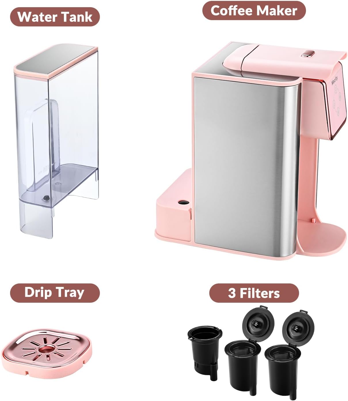 Easy to Clean – BPA-FREE material for water tank and piercing needle. Detachable filter basket and drip tray can be removed and washed directly. A easy clean method by pressing button after adding in water and vinegar.