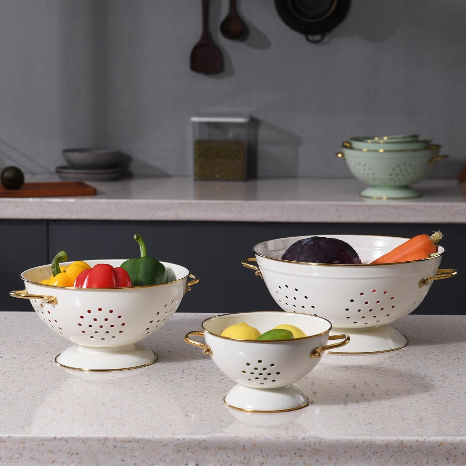 The special gold handles add to the overall look, and the metal handles feel comfortable and sturdy. Comes with a sturdy base to support food whether waiting on the countertop or rinsing in the sink.