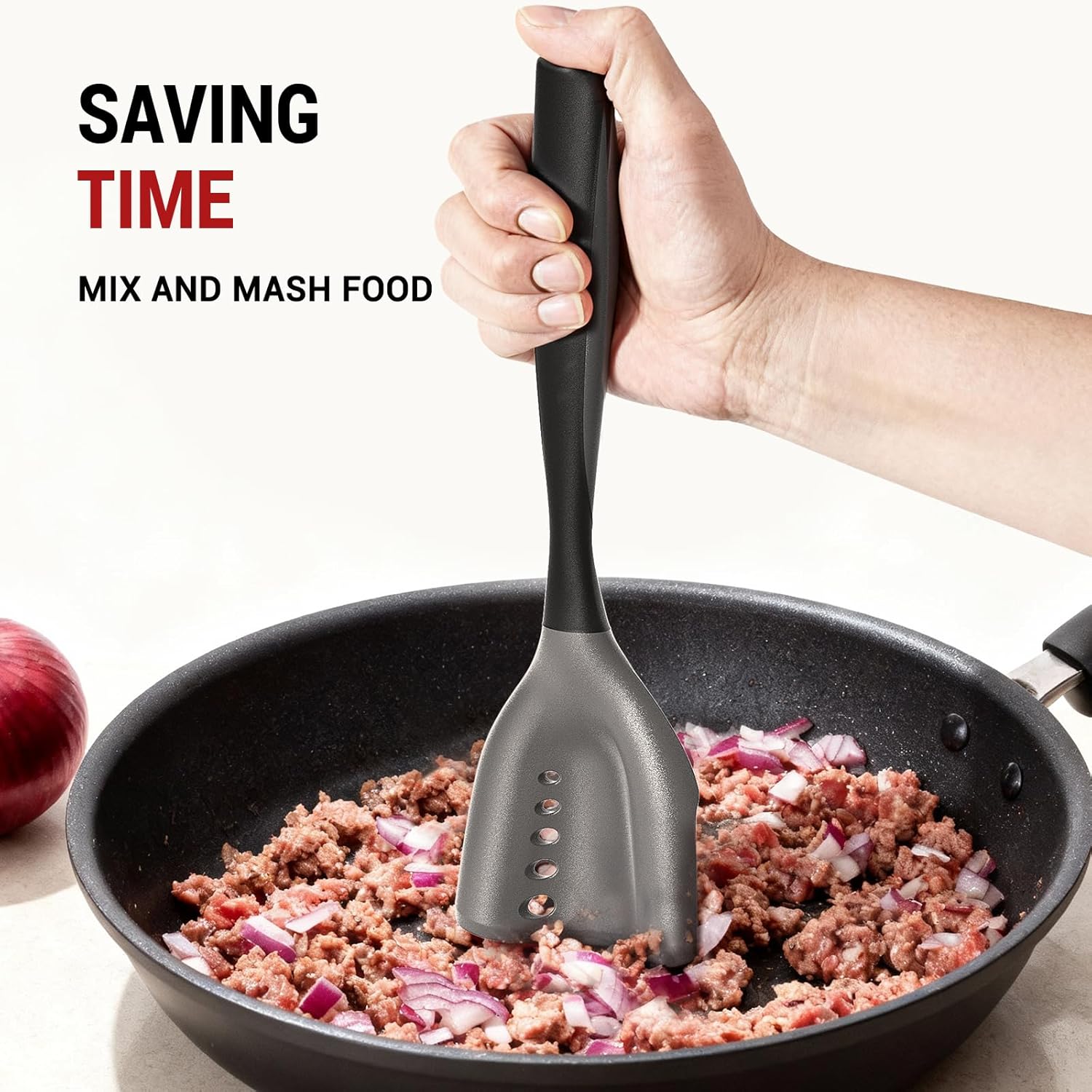 [Premium Material] Our ground meat masher has a nylon core and is coated with a silicone layer for chopping and scooping food. The silicone outer layer is also compatible with all cookware and won’t scratch the surface of your pots and pans.