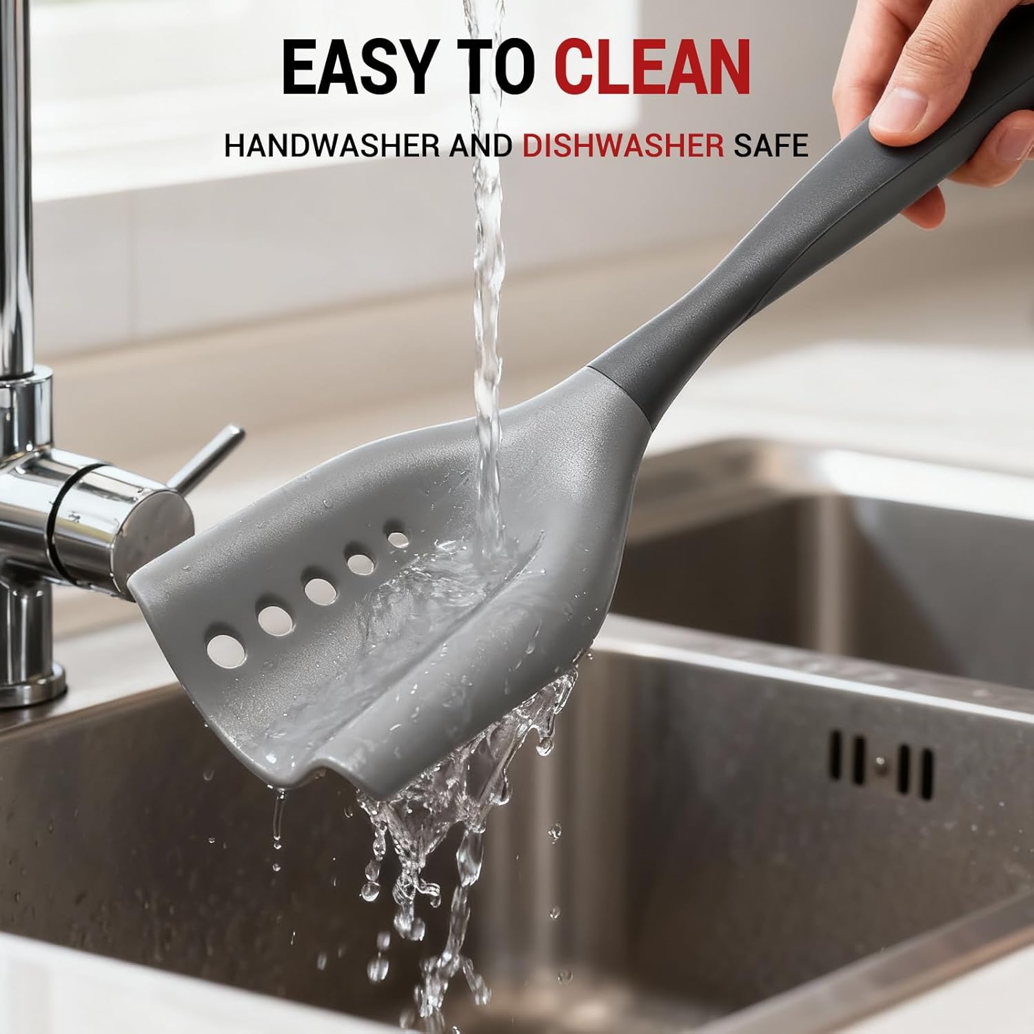 [Large Curve Design] The large curve design of the spatula area makes scooping and placing food easier and faster. The ergonomic soft-grip handle with thumb rest is more comfortable to hold.