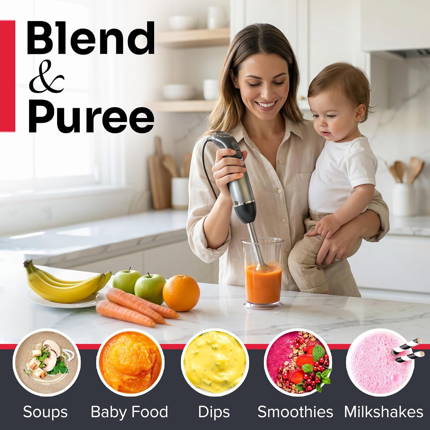 UNMATCHED POWER – From our Titanium reinforced 4 blade rotation system, to our full copper 800 watt clump destroying motor, no other stick blender matches this model’s ability to crush, pulverize, and smoothly blend, so any recipe or smoothie can be made with the easiest cleanup.