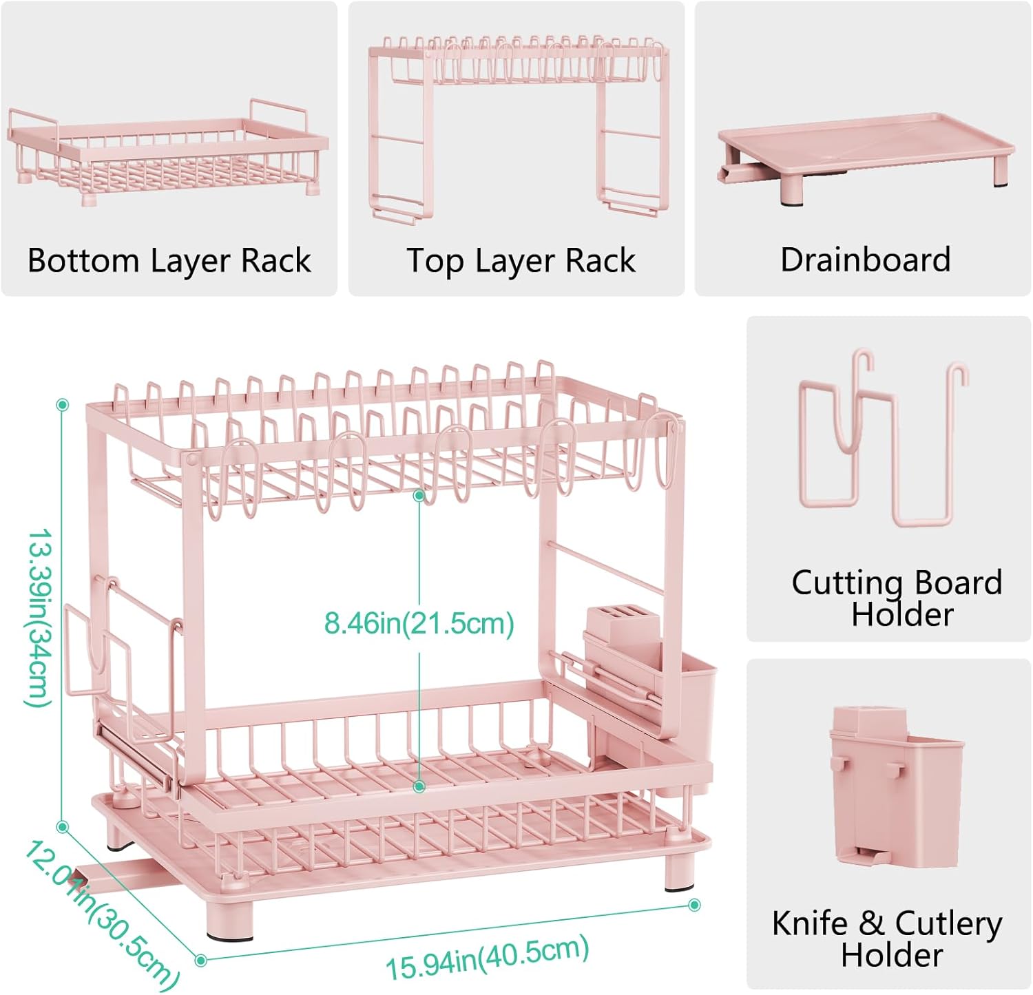 【MULTIPURPOSE DISH RACK】Size: 15.94″D x 12.01″W x 13.39″H.This multifunctional dish rack and drainboard set features multiple accessories, including 2 racks, 1 utensil holder, 6 cup holder accessories, 1 drainboard,and 1 cutting board holder, which can efficiently help you store diverse kitchenware. This dish drying rack can meet all your needs for storing and drying tableware