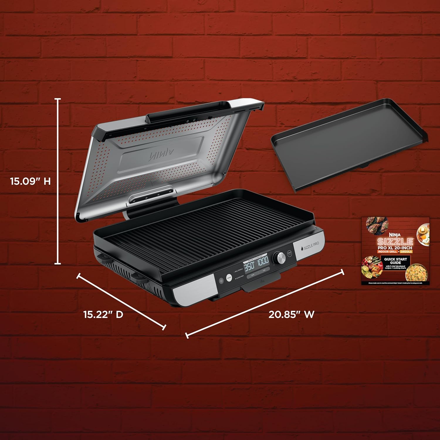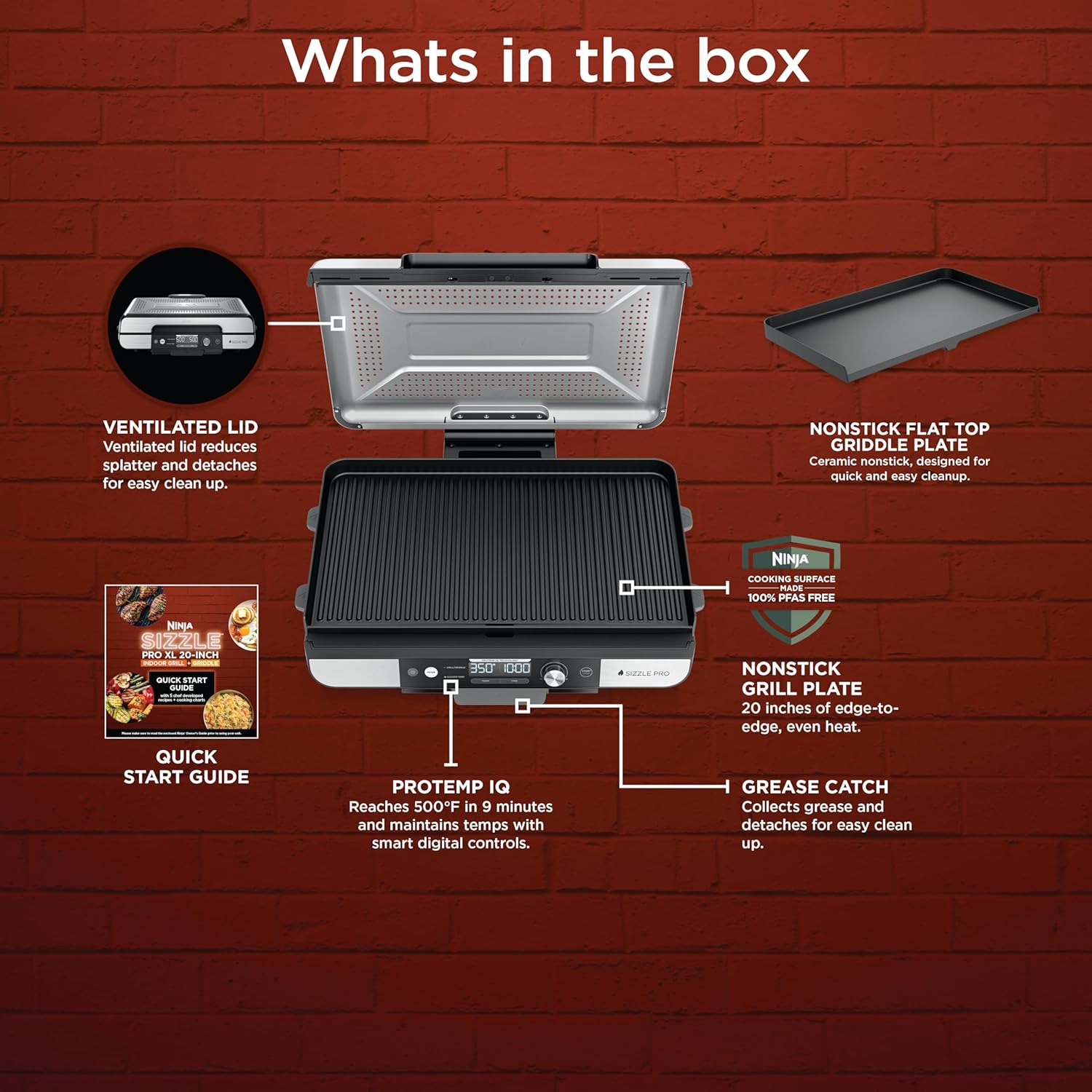 WHAT’S INCLUDED: Ninja Sizzle Pro XL Indoor Griddle and Grill, 20-inch Nonstick Flat-Top Griddle Plate, 20-inch Nonstick Grill Plate, Detachable Ventilated Lid, Removeable Grease Catch, and Quick Start Guide with 5 chef-developed recipes.