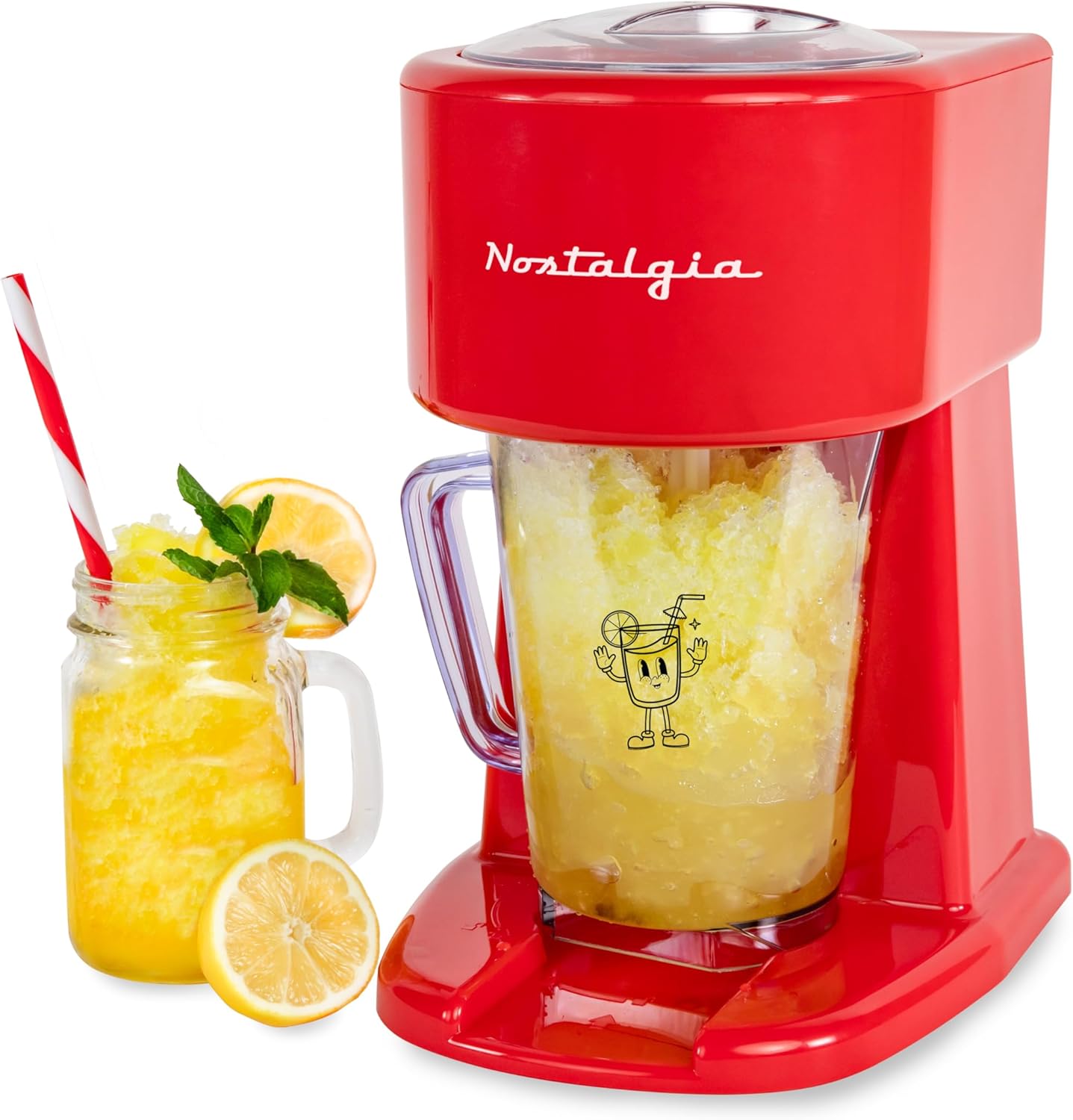 Bring the party to life with refreshingly icy drinks using the Nostalgia Frozen Beverage Station! Entertain guests at pool parties, birthdays and more; the large pitcher serves up to 40-ounces of drinks. Making recipes like slushies, daiquiris, and margaritas is easy! After adding ice and your beverage choice, start shaving with the simple twist of the lid. While the ice is being shaved, the mixing paddle simultaneously stirs the frozen beverage creating a perfectly mixed frozen drink. The precision-cut stainless steel cutting blades equipped with this machine quickly and efficiently shave ice cubes into delicious, fluffy snow-like ice. Get creative with your drink creations and use any of your favorite beverages such as soda, fruit juices, cold coffee and more. The Frozen Drink Maker not only provides tasty refreshments, but adds a fun and unique flair to your countertop setup with its retro design. Making drinks is a blast with Nostalgia!