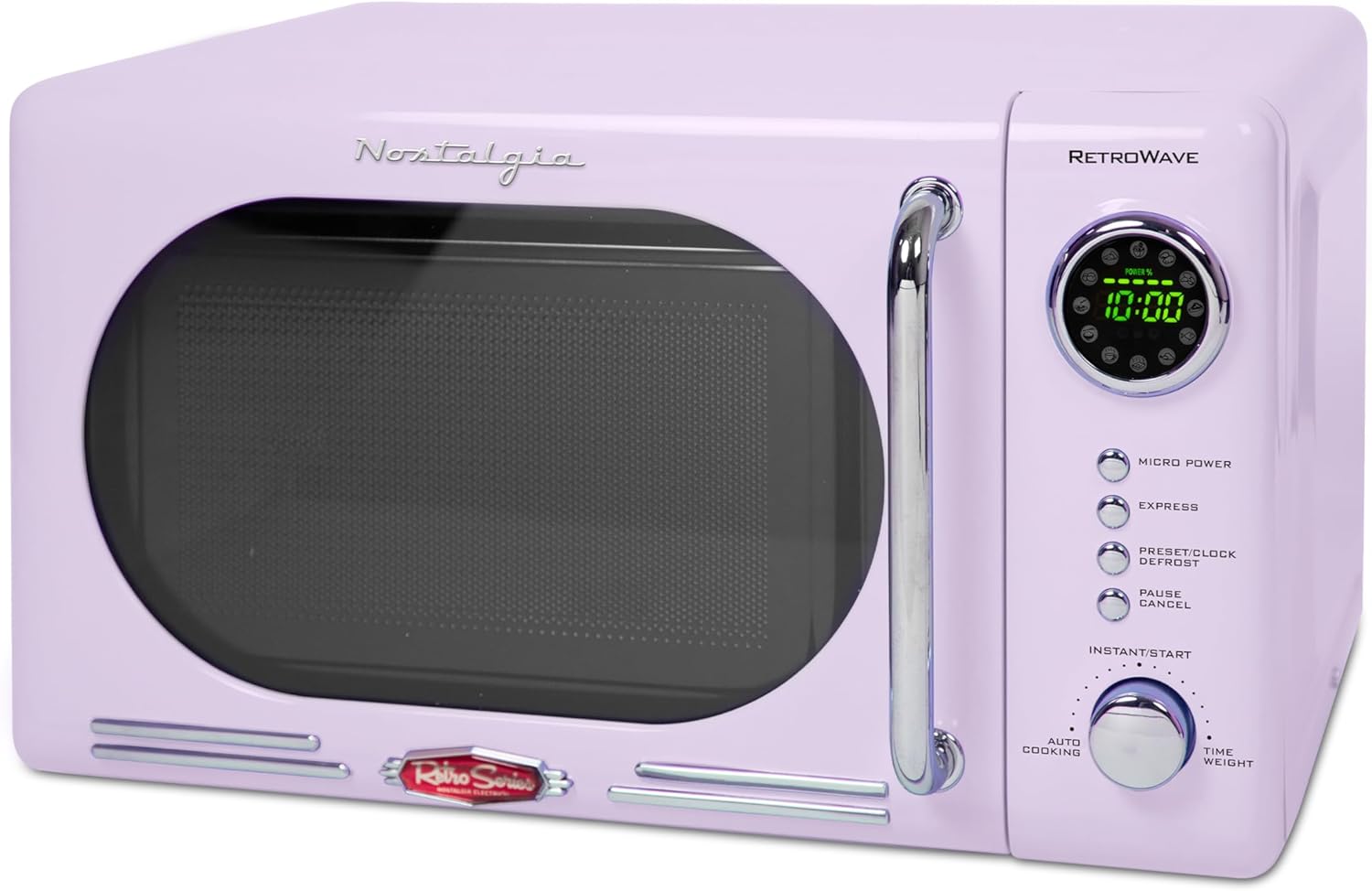 RETRO ACCENTS: A sleek chrome door handle, control panel and accents add fun and flair to this unique retro-styled appliance