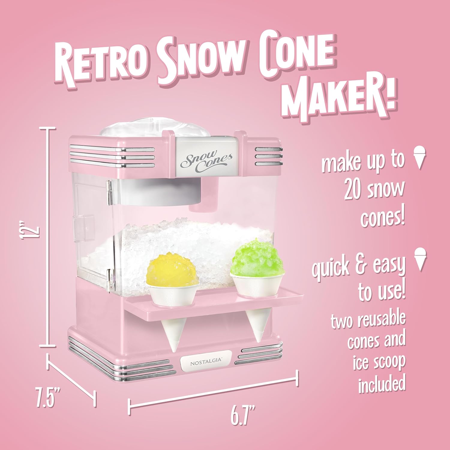 Nostalgia Retro Snow Cone Maker – Countertop 5-qt Shaved Ice Machine – Stainless Steel Blades – Includes 2 Reusable Cups, Ice Scoop, & Sid Shelf – Pink