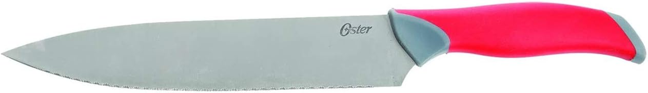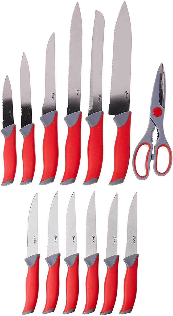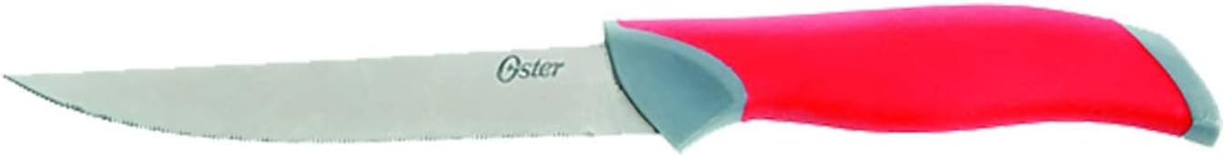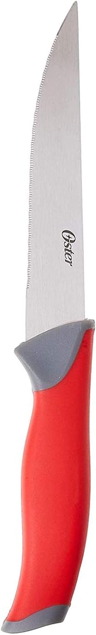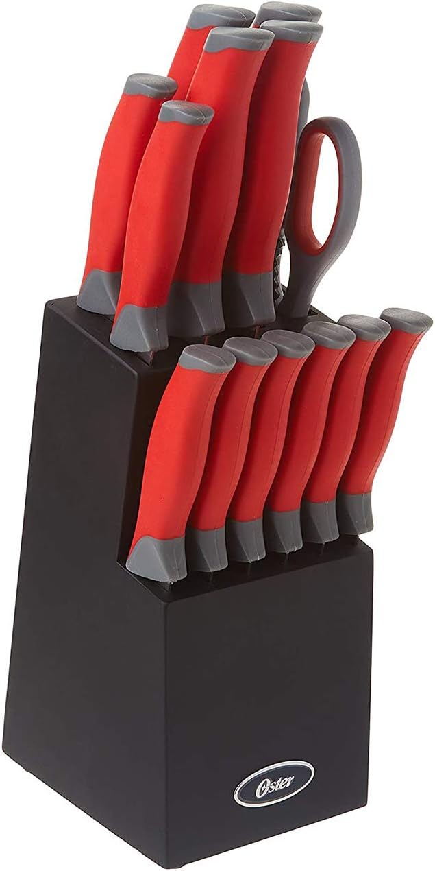 Make sure all your slicing and dicing needs are met with the comprehensive Oster Lindbergh 14 piece cutlery set with Red handles. Each piece of this precision set is built to last. All pieces are stored in a handy black rubber wood block, adding elegance to your countertop. Full tang construction keeps your knives properly balanced. Easy to clean and of the highest quality.