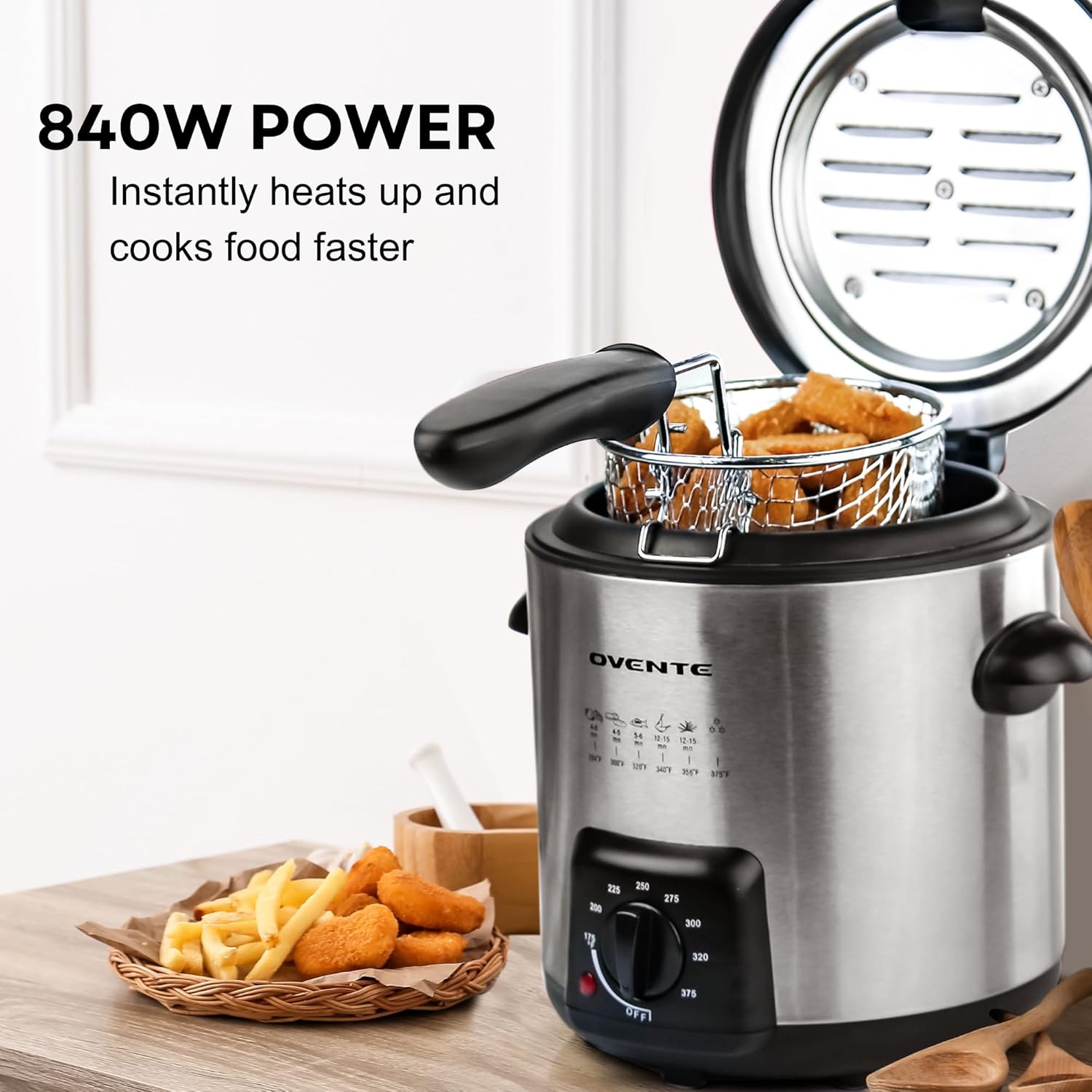 OVENTE Electric Deep Fryer, 0.9L Capacity, 840W with Adjustable Temperature, Locking Lid, Removable Fry Basket & Cool-Touch Handles, Stainless Steel Countertop Fryer, Silver FDM1091BR