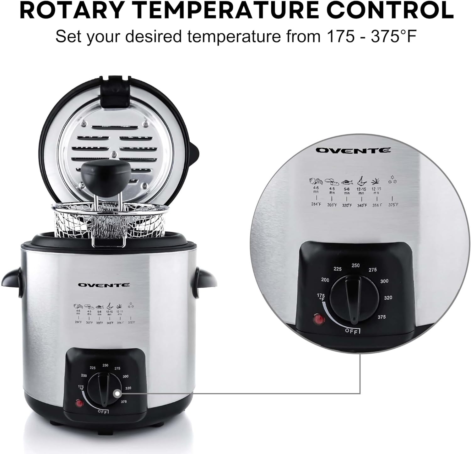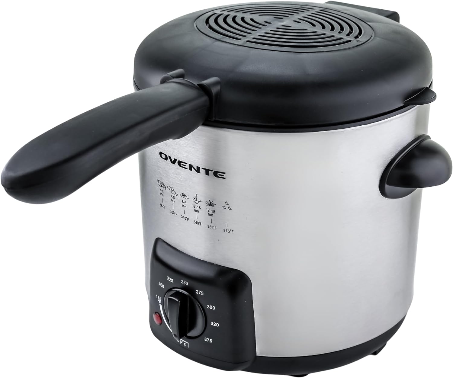 Fry delicious crispy favorites right at home with the OVENTE 0.9L Electric Deep Fryer. A compact yet powerful countertop fryer designed for convenience, performance, and everyday use. Featuring an 840-watt concealed heating system, this fryer heats up quickly and maintains consistent oil temperature for even frying and golden results. Enjoy precise control over your cooking with the adjustable temperature knob (175°F to 375°F), perfect for frying everything from French fries and chicken wings to fish sticks, mini donuts, and more. The locking lid reduces messy splatters and odors, while cool-touch handles provide safer handling during cooking. Cleanup is easy thanks to the non-stick interior and removable fry basket, and the brushed stainless-steel finish adds modern style to any kitchen countertop. Whether you’re preparing snacks for one or two people, this compact fryer delivers great performance with minimal storage space required.