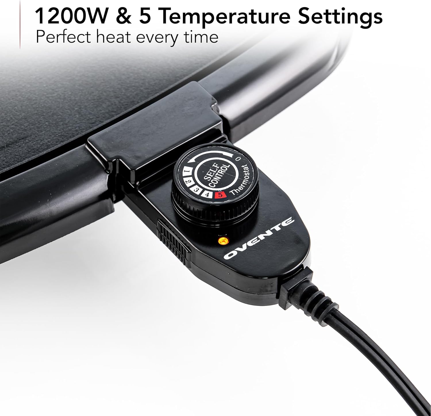 ABSOLUTE CONTROL – This griddle grill operates at 1200 watts (120 volts) with 5 temperature settings (200-400°F). It features a rapid heating element for precise grilling—perfect for searing, simmering, warming, or frying breakfast dishes.