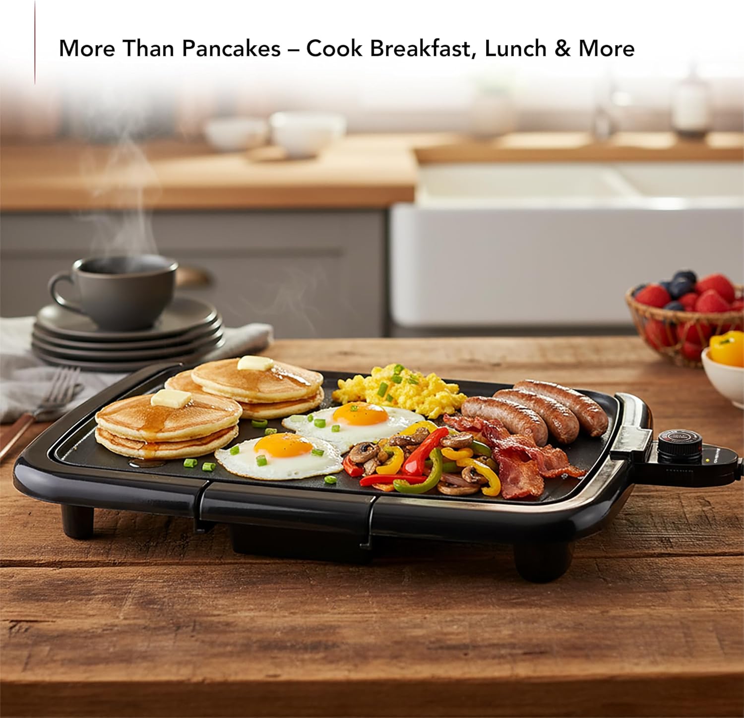 MORE THAN PANCAKES – Upgrade your cooking skills with our electric griddle nonstick. Its 16” x 10” plate cooks pancakes, French toast, eggs, bacon, burgers, grilled cheese, sautéed vegetables, quesadillas, and much more in minutes.