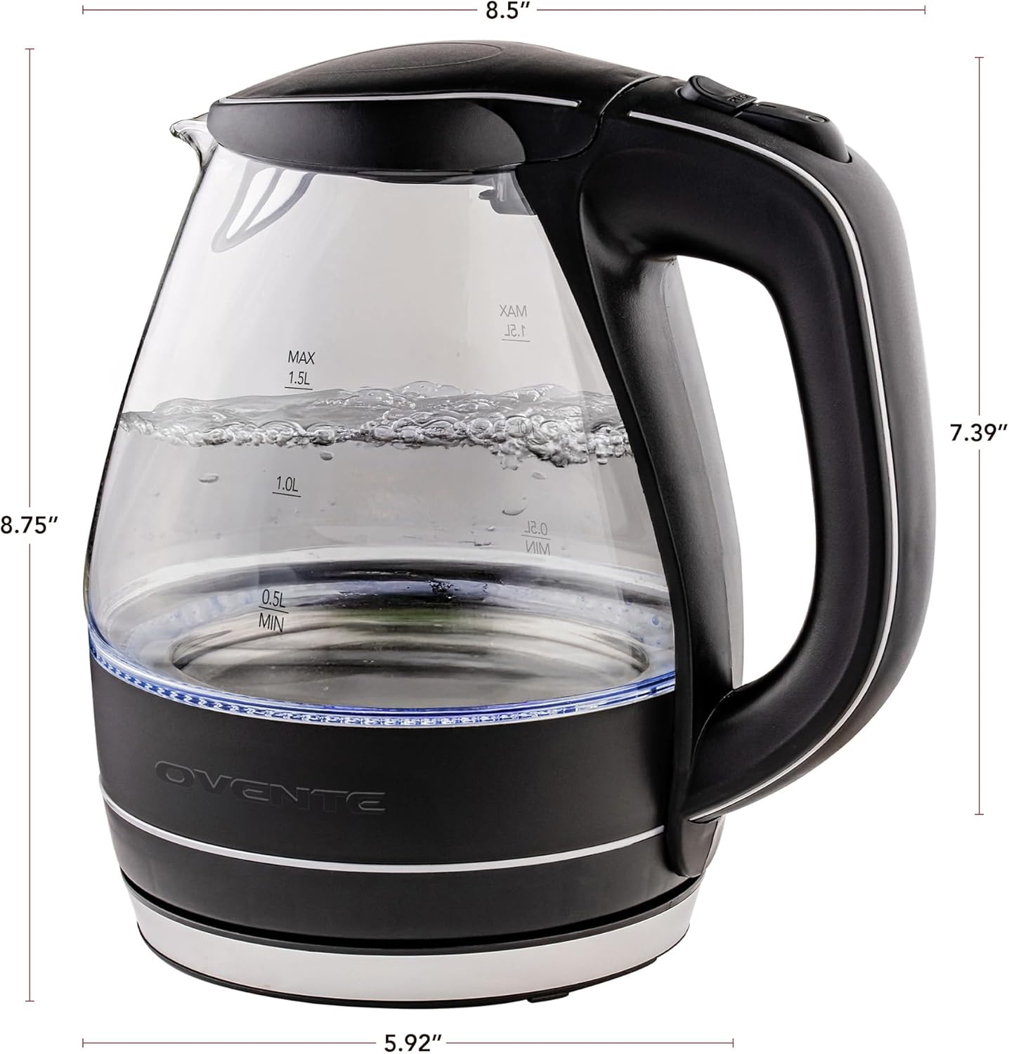 The OVENTE KG83 Series Electric Glass Kettles are our best sellers for a reason. Their sleek, modern design makes them the perfect addition to any countertop. Available in 7 vibrant colors – black, green, orange, pink, purple, red, and white – they’re as stylish as they are functional. A halo of blue LED lights beautifully illuminates the kettle while it’s in use, adding a touch of elegance to your kitchen. With a 1.5-liter capacity, 1100 watts of power, and high-quality borosilicate glass construction, this kettle quickly brings water to a rolling boil in just minutes. Whether you’re preparing hot coffee, tea, oatmeal, soup, or instant macaroni, this kettle gets the job done fast. Plus, it’s 50% more efficient than traditional stovetop kettles, helping reduce your electricity use and save you money. Designed with convenience and safety in mind, this kettle features a concealed stainless steel heating element that minimizes mineral deposits like nickel in your drinking water. It also has a one-touch flip-back lid with a wide opening for easy filling and cleaning. For added peace of mind, it’s equipped with an automatic shut-off feature that kicks in once the water reaches boiling and Boil-Dry Protection technology that prevents it from turning on when there’s no water inside. Other thoughtful features include a secure locking lid, a washable filter, and a comfortable, stay-cool handle and button. The 30-inch cord wraps neatly into the base for easy storage, keeping your kitchen tidy and organized. NOTE: Electric kettles may reach boiling faster at higher altitudes due to the fluctuation of boiling points. **CAUTION: KETTLE BODY MAY BE EXTREMELY HOT DURING OPERATION. PLEASE BE EXTRA CAREFUL AND USE THE COOL-TOUCH HANDLE TO AVOID BURNS.**