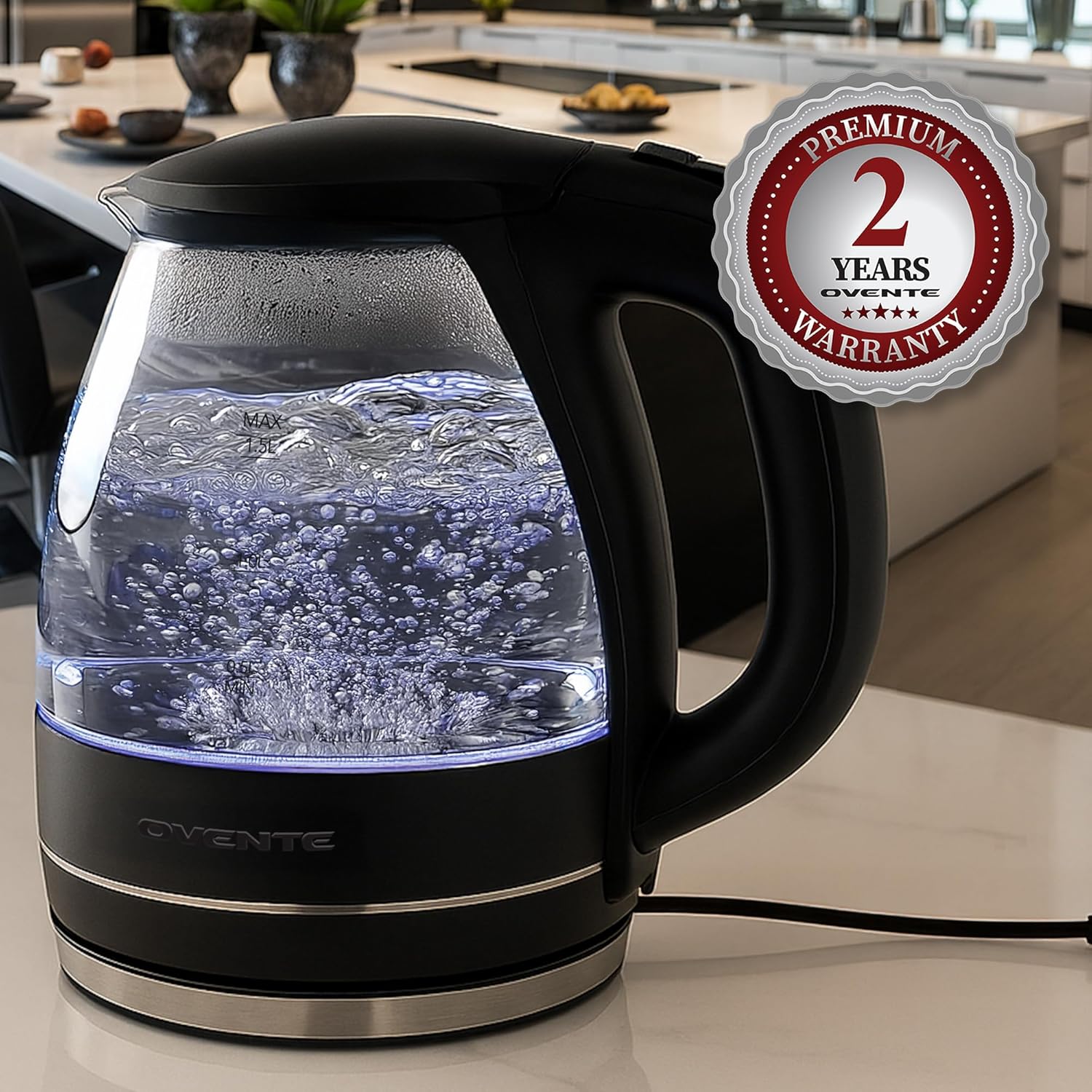 A BLEND OF STYLE & DURABILITY – The OVENTE KG83 Kettle Series holds the #1 spot among our best-selling products, beloved by customers across the USA for its aesthetics, durability, and functionality. Featuring a halo of blue LED lights that illuminate the kettle during use, it’s constructed from heat-tempered, stain-resistant borosilicate glass and stainless steel, ensuring long-lasting performance.