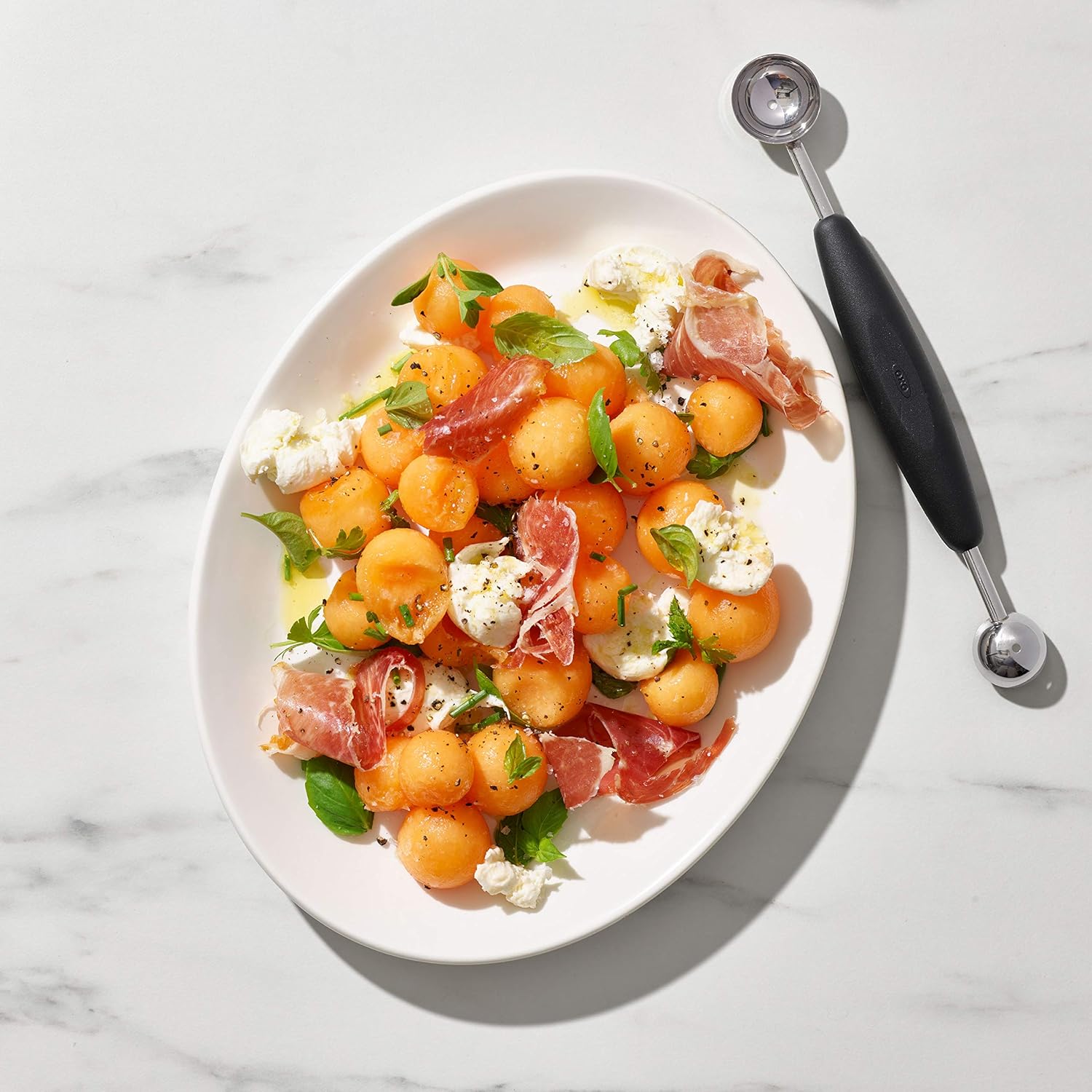 “The OXO Good Grips Double-Sided Melon Baller does more than make perfectly sized melon balls. Use it to prep a variety of fruit, veggies, sweet and savory items, too. The small-sized scoop cleanly removes seeds from vegetables like bell peppers, cucumbers and summer and winter squash; you can even use it to make homemade truffles. The big scoop is perfect for fruit salad, ice cream, drop cookies and more. Durable stainless steel edges are safe to the touch, but neatly scoop fruit without piercing the skin. The non-slip grip is comfortable to hold and stays secure even when things get messy. Dishwasher safe. “