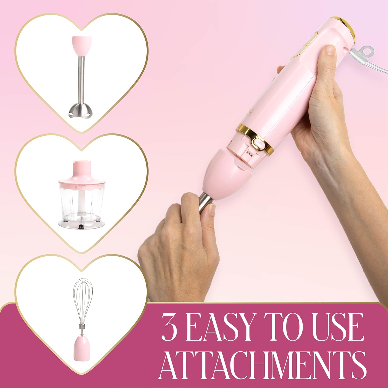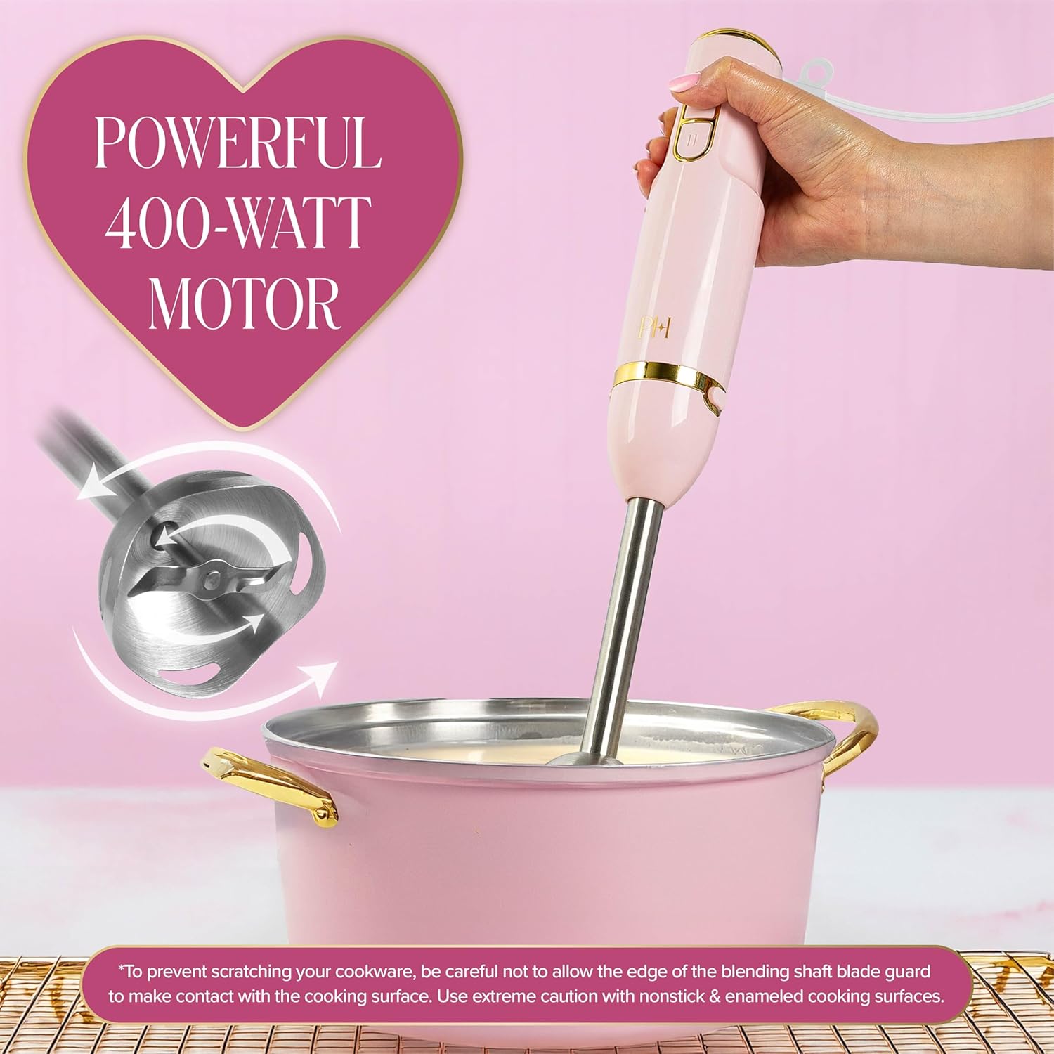 Paris Hilton Hand Blender Set, 2-in-1 Immersion Stick Blender with Whisk & Blending Shaft, 400W High Speed, Pink with Gold Accents – Smoothies, Soups, Sauces, Baby Food, Whipped Cream, Pink