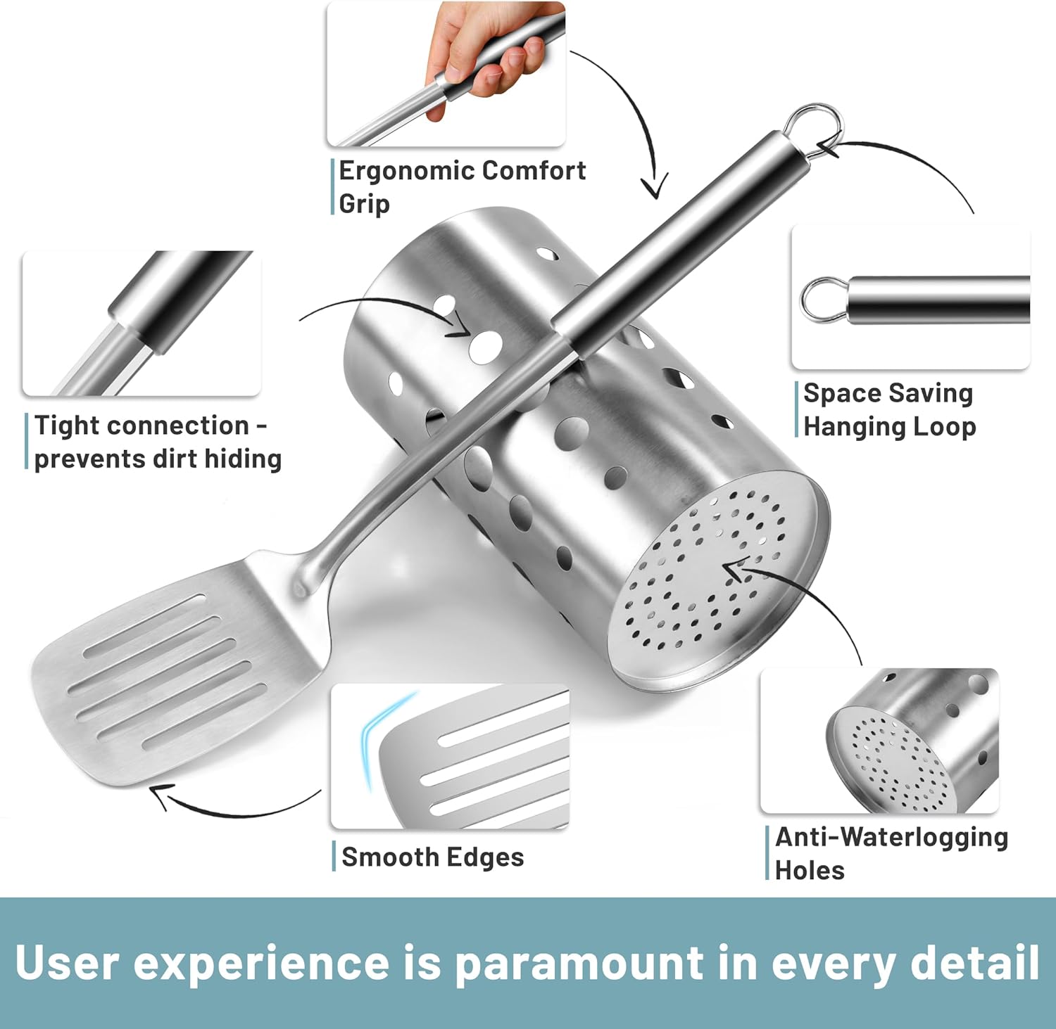 【Ergonomic Heat-Resistant Handle】The long handle of the kitchen utensils with hollow heat-proof design that make the handle more heat resistant. The stainless steel cooking utensils set detail design of the handle will effectively prevents damage to the hands from excessive temperatures when cooking or serving food. Moreover, the kitchen utensils ergonomic round handle for easily holding that more comfortable and secure for you to use