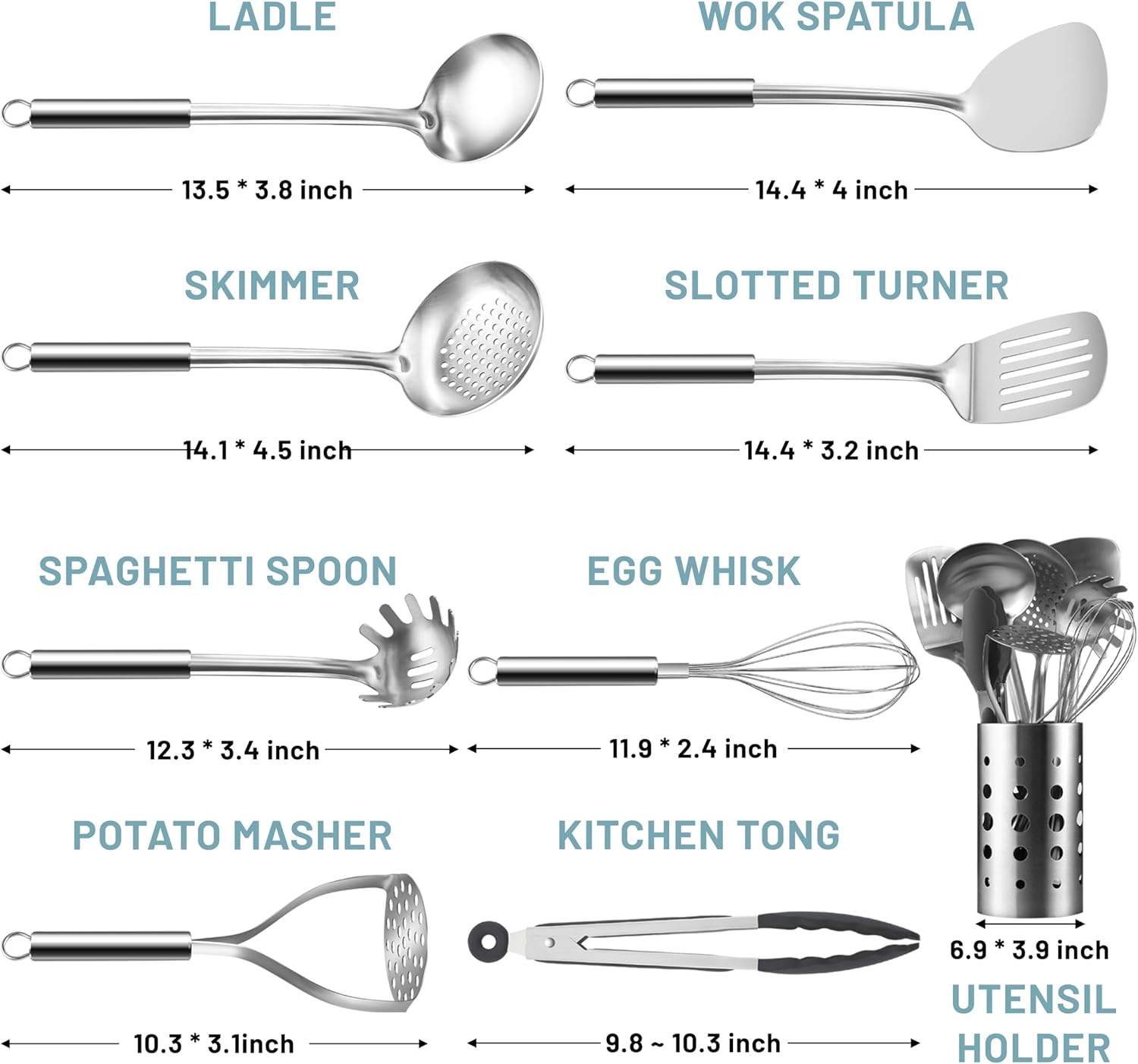【For all your kitchen needs】This 9-piece kitchen utensils set includes everything you need for all your cooking tasks: 1 Ladle, 1 Slotted Spoon, 1 Slotted Turner, 1 Wok Spatula, 1 Spaghetti Spoon,1 Potato Masher, 1 Egg Whisk, 1 Tong for cooking, 1 Utensils Holder