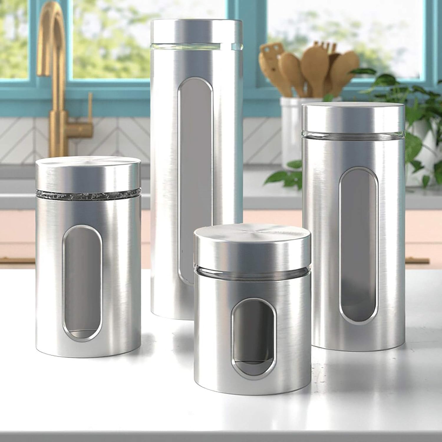 Product Summary: Quality 4pc Stainless Steel Canister Set for Kitchen Counter with Glass Window & Airtight Lids, Food Storage Containers, Pantry Storage & Organization Set for Coffee, Flour, Pasta, Rice, Spices, Herbs
