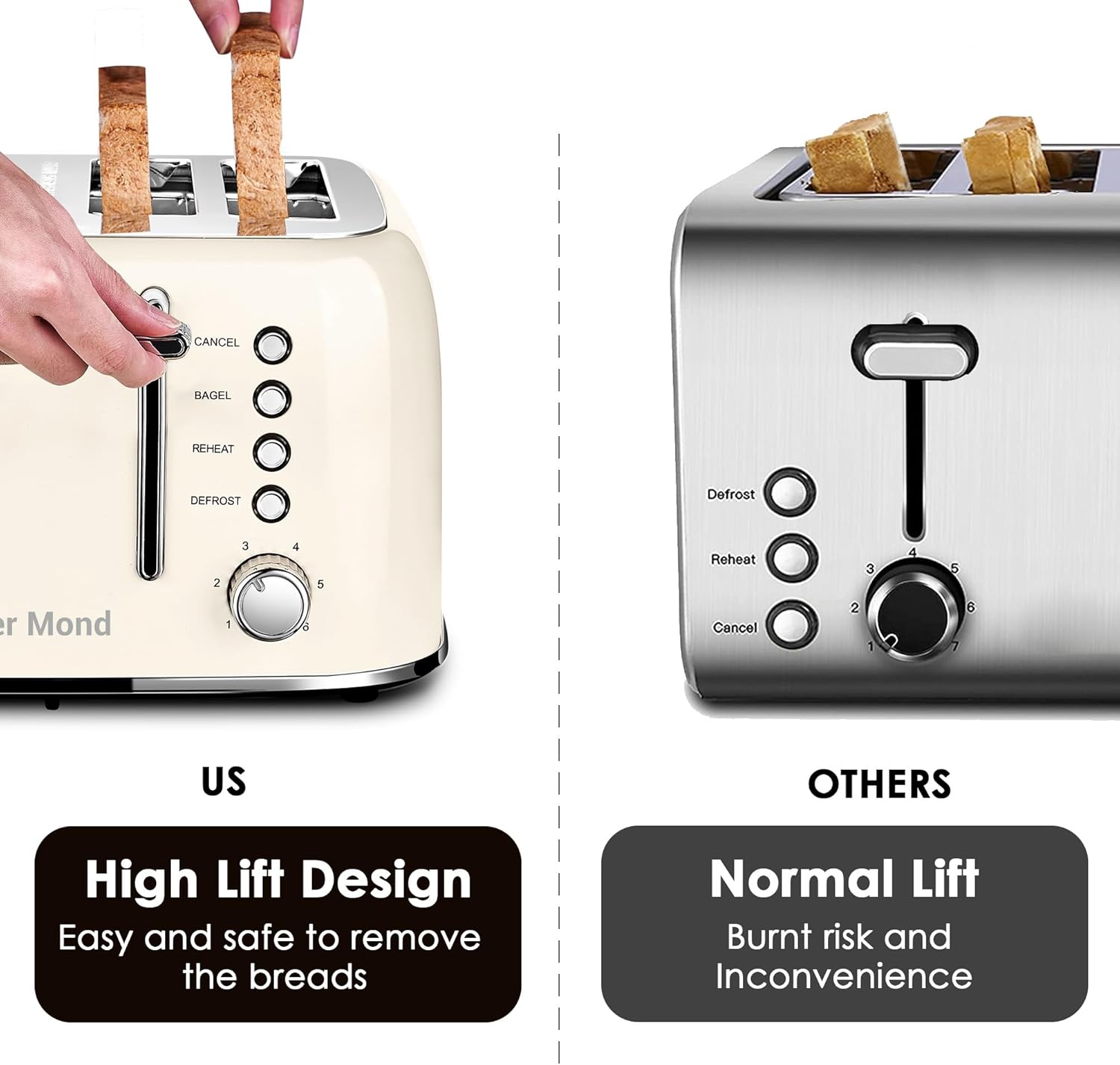 Delicate Design: Retor Mond retro toaster 4 slice perfectly fits your kitchen environment and also creates perfect valentine vibes. It is also a great thing for Christmas, birthdays, thanksgiving, weddings, etc. Stainless steel surface with premium paint brings a slice of color to any corner of your house. High lift design provides more protection to avoid burnt risk when removing bread. Pull the removable trays at the bottom to dump crumbs after toasting, pretty easy to clean