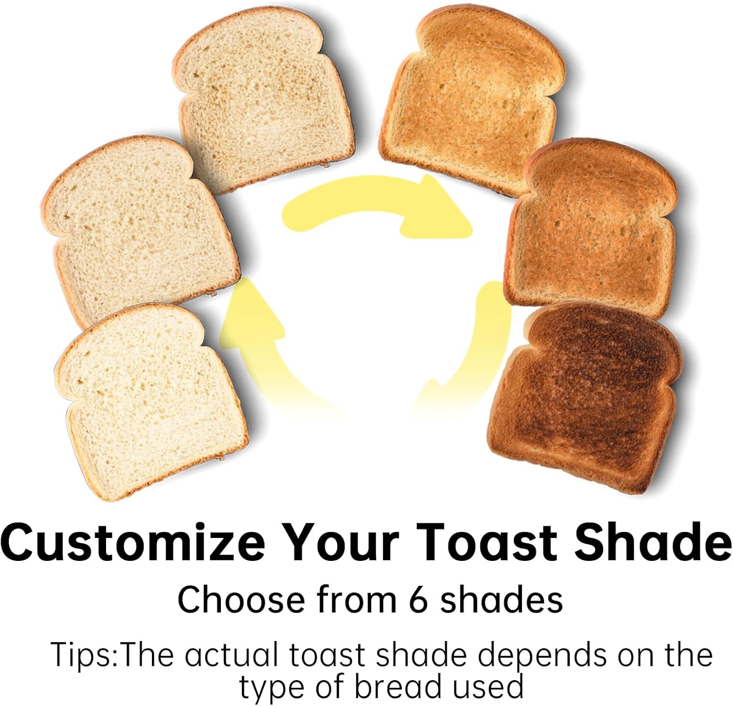 Customizable Toast Levels:With a simple turn of the control knob, you can choose from 6 browning levels to match your preferences, ranging from light to dark toast.