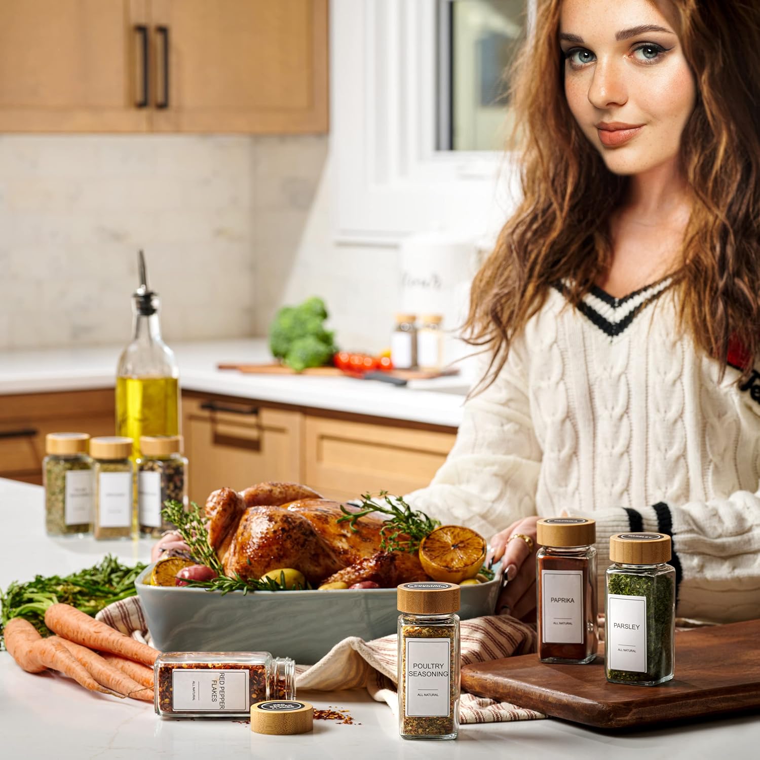 All-in-One Spice Jar Organizer: Includes 24 clear glass square jars, 24 shaker lids, assorted labels, a marker, and a collapsible silicone funnel