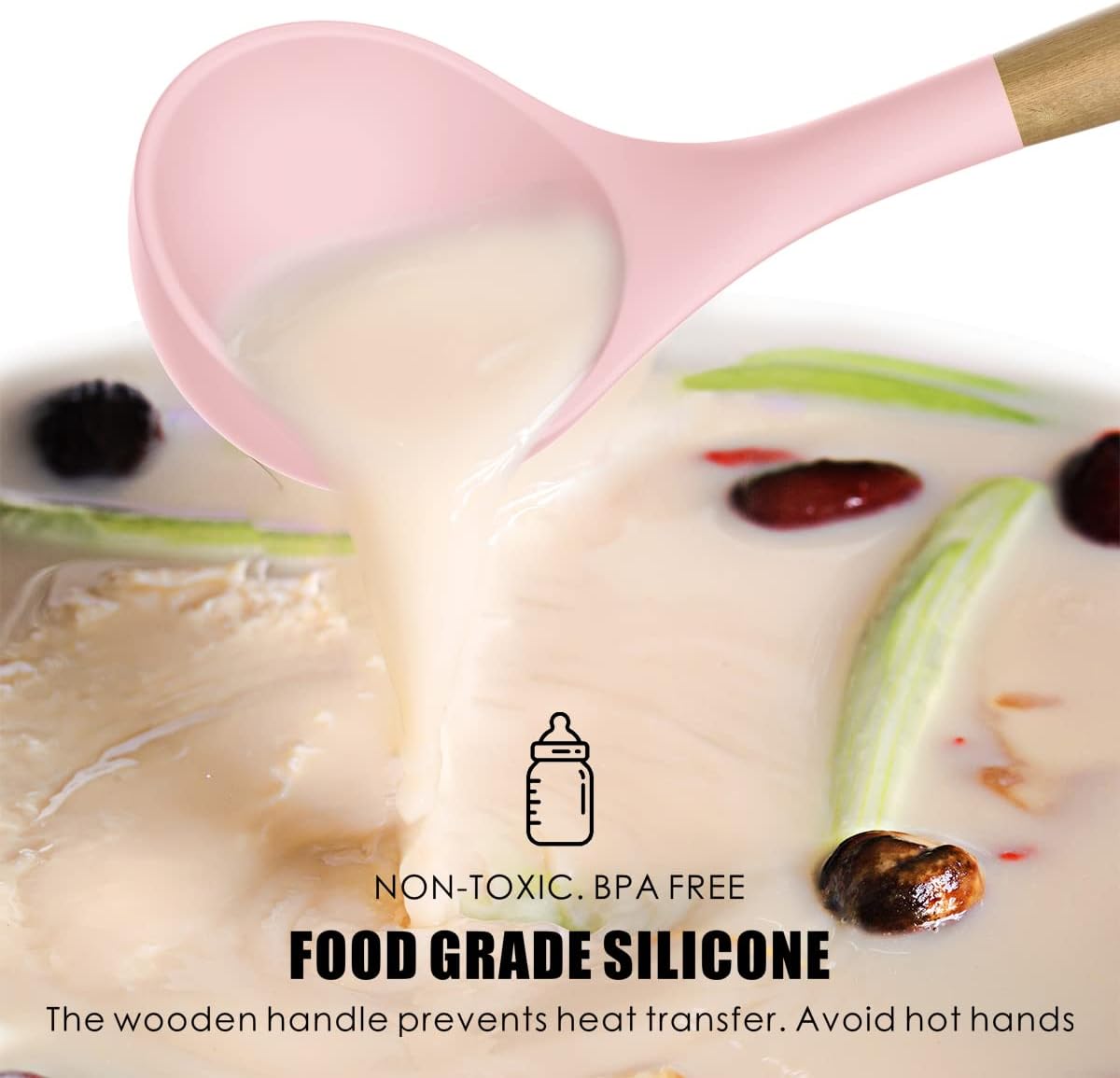 The wooden handle of silicone kitchen utensils prevents heat transfer, reducing the risk of burns. With low thermal conductivity, it stays cooler during high-temperature cooking, offering a comfortable grip. Additionally, it provides stability and prevents slipping.