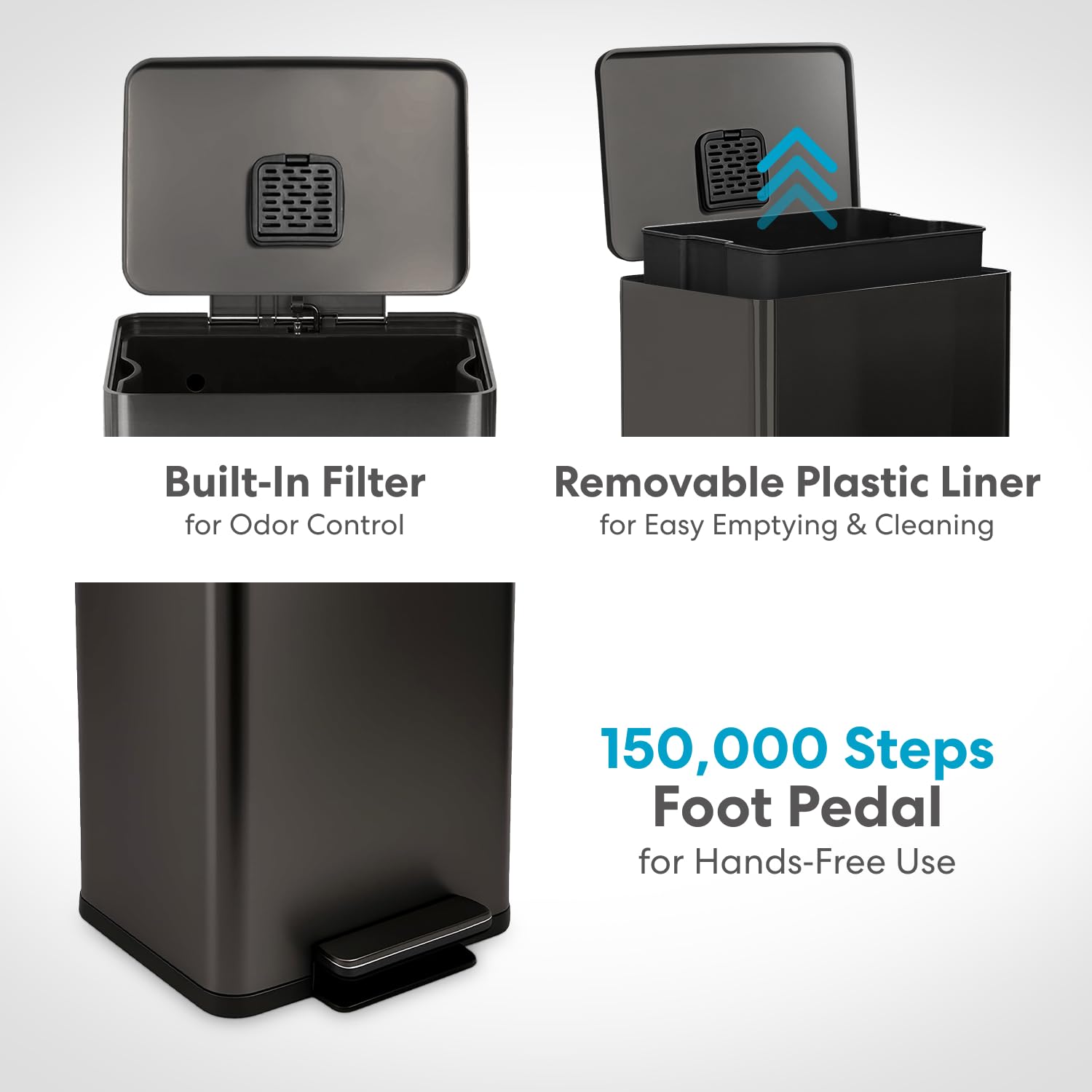 Quiet-Close Lid: Lid closes quietly and gently without slamming. Hands Free and Fingerprint Proof: Hands-free operation with durable a metal foot pedal and fingerprint-resistant stainless steel finish leads to your trash can staying cleaner longer