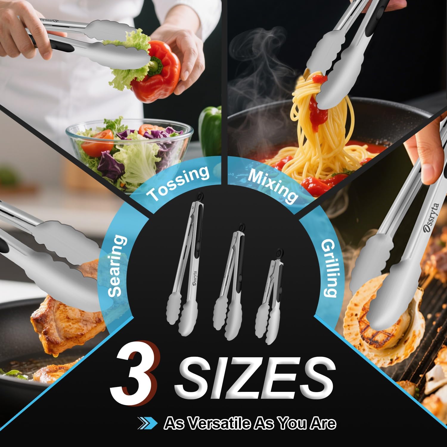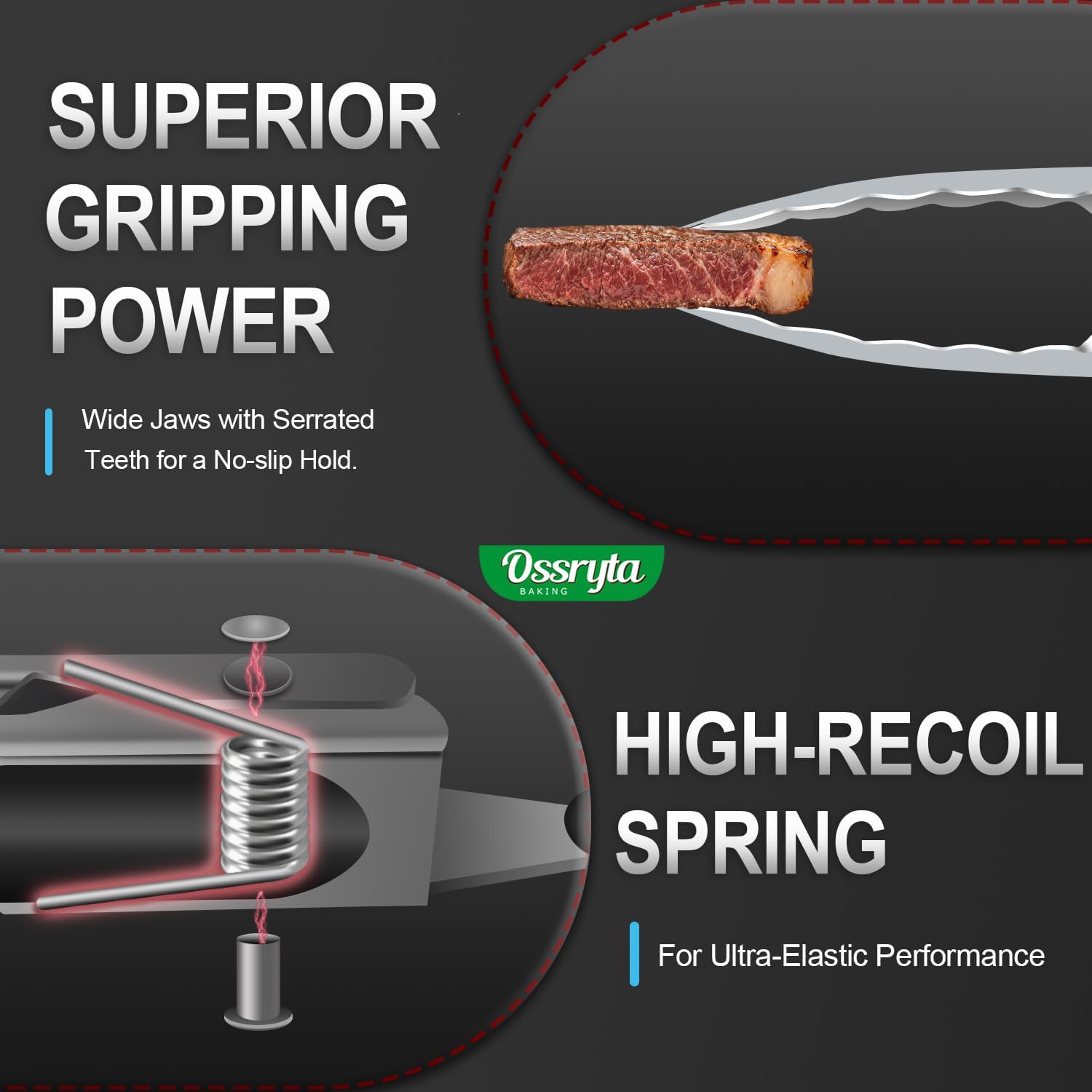 MULTI-SIZE FOR EVERY KITCHEN TASK – Ossryta 3-piece tong set! The long 12″ tongs safely handle deep frying and grill flipping, while the 9″ version perfectly serves salads and pasta. For delicate tasks like plating desserts or grabbing toast, the compact 7″ tongs offer precision control. All sizes feature the same professional 600°F heat resistance – whether you’re searing steaks or tossing salads, you’re covered. Perfect as cooking tongs, grill tools, or for retrieving food from boiling water