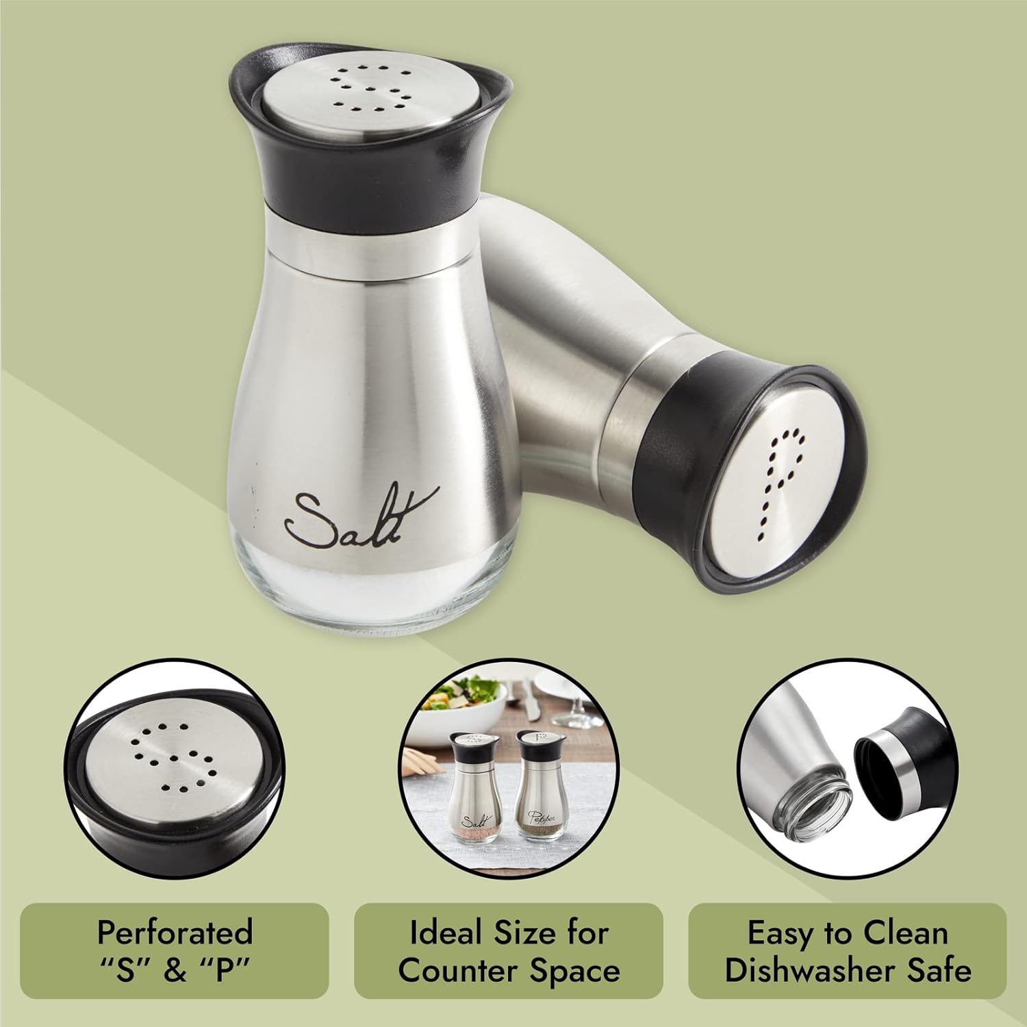 Convenient Refill Design: Monitor seasoning levels effortlessly with the clear glass bottoms, making refills straightforward and efficient. The stainless steel salt and pepper shakers are designed for long-lasting use in any home and kitchen