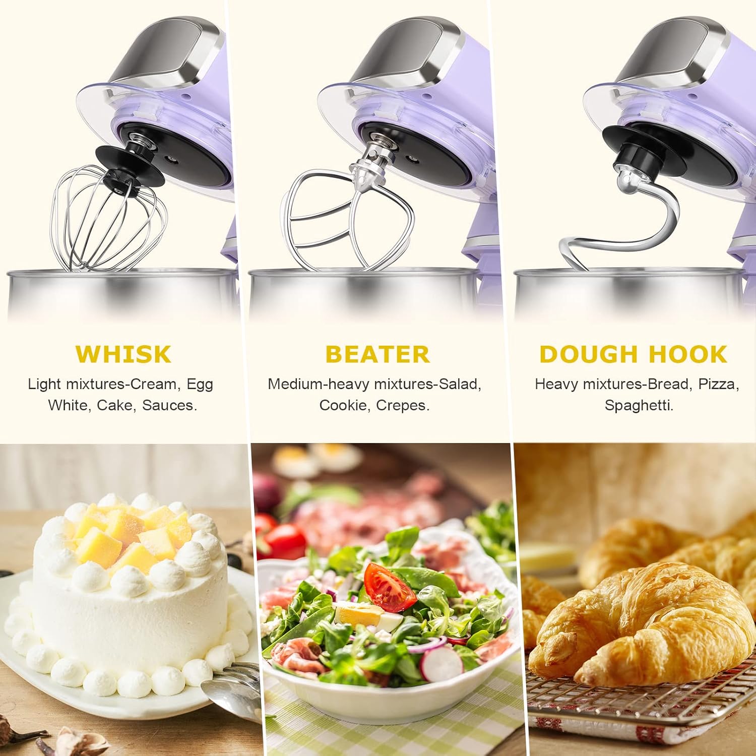 3.2Qt Capacity and Tilt Head Design – Our little kitchen mixer equipped with 3.2Qt stainless steel bowl,suitable for new baker,1-2 members family or couples,easy to operate and clean up.Tilt-head design mixer allows access to install or uninstall bowl and accessories easily.And transparent anti-splash lid could prevent the ingredient making a mess.