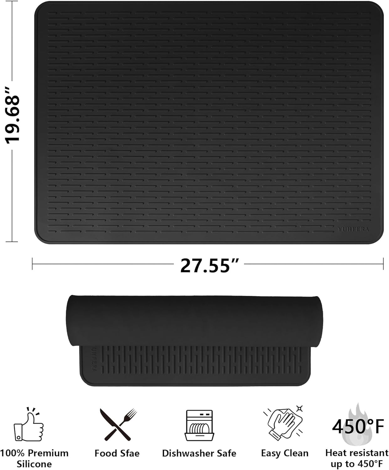 Kitchen Drying Mat:The unique design of wide raised line ridges increases air circulation, improves ventilation, and catches drips from dishes, glasses, fruits, and vegetables. The high edges and waterproof bottom keep the countertop dry and clean, making it an ideal kitchen drying mat.