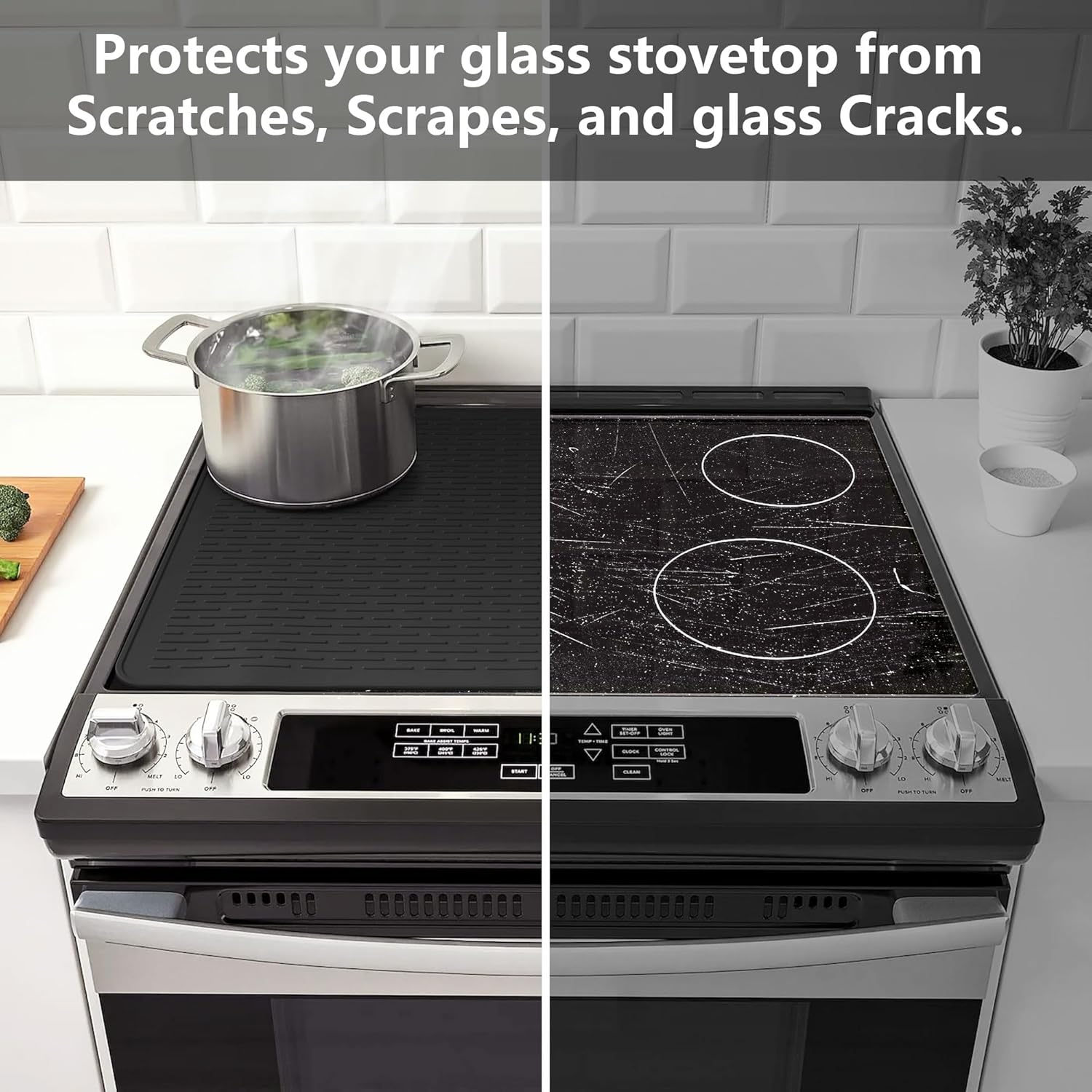 Glass Top Stove Cover:This extra large 28″ x 20″ inches silicone stove cover for glass top electric stove is perfect for protecting your electric stove top, kitchen counter top, electric cooktop, table, or washer-dryer top from scratches, spills, stains, scrapes, and dirt. It keeps the surface clean and tidy while providing an expandable workbench for food preparation.