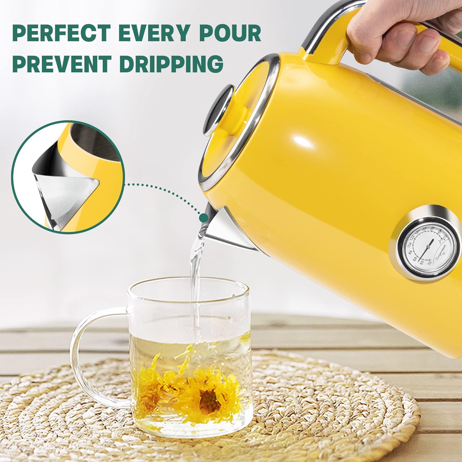 SUSTEAS Electric Kettle – 57oz Hot Tea Kettle Water Boiler with Thermometer, 1500W Fast Heating Stainless Steel Tea Pot, Cordless with LED Indicator, Auto Shut-Off & Boil Dry Protection, Retro Yellow