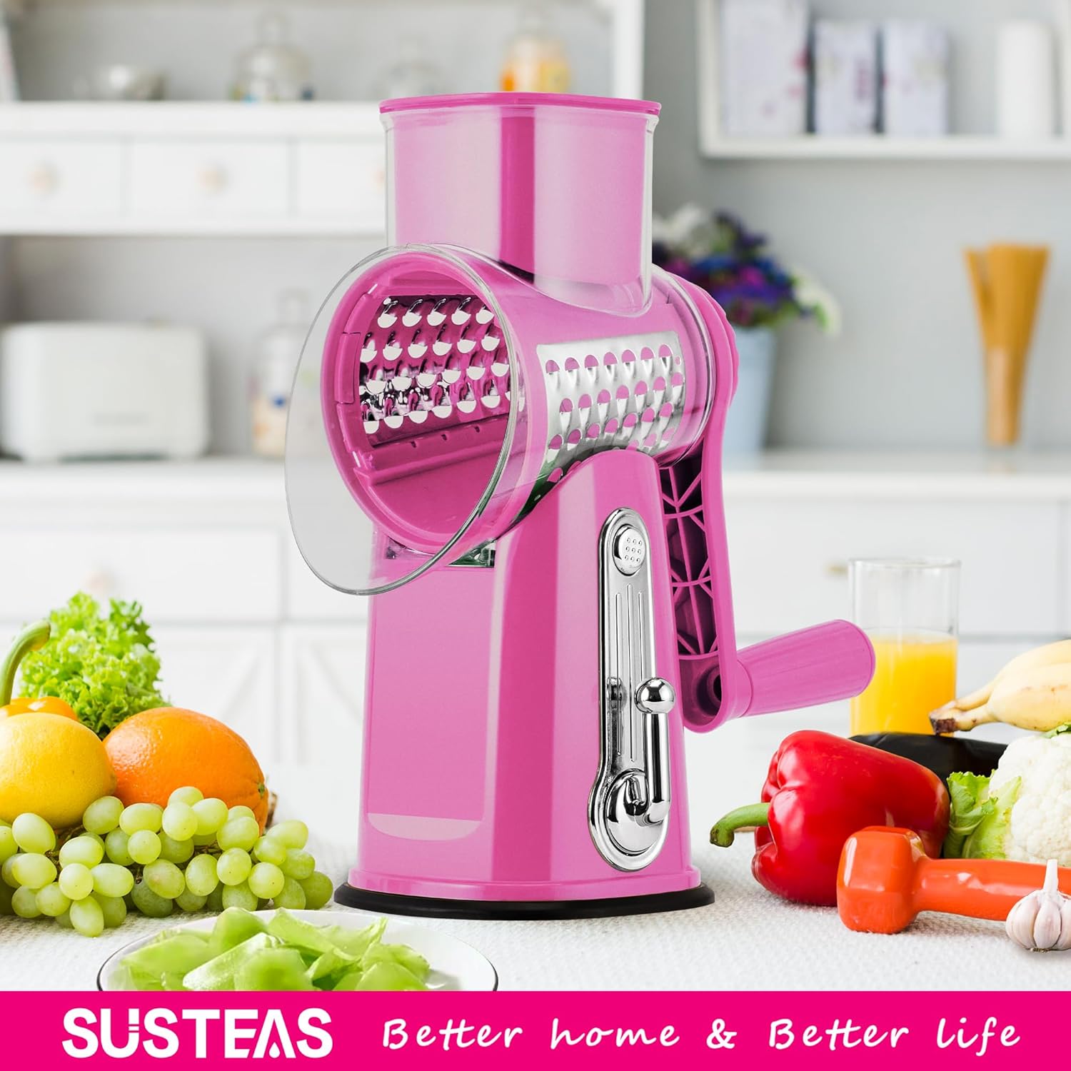 The SUSTEAS Rotary Cheese Grater is available in pink.