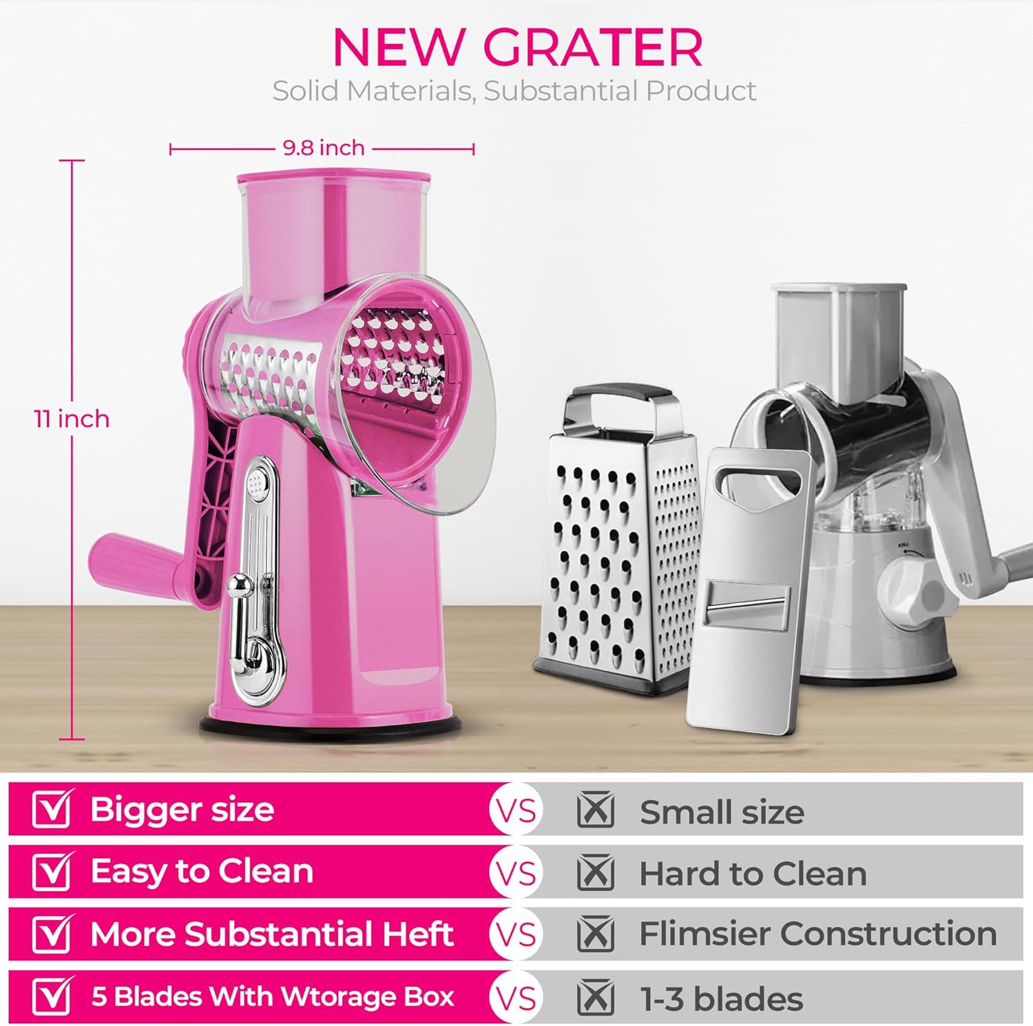 SUSTEAS Rotary Cheese Grater with Handle – Vegetable Shredder with 5 Well-designed Blades & Strong Suction Base,Round Mandoline Slicer & Food Chopper for Kitchen,with Blade Storage Box(Pink)