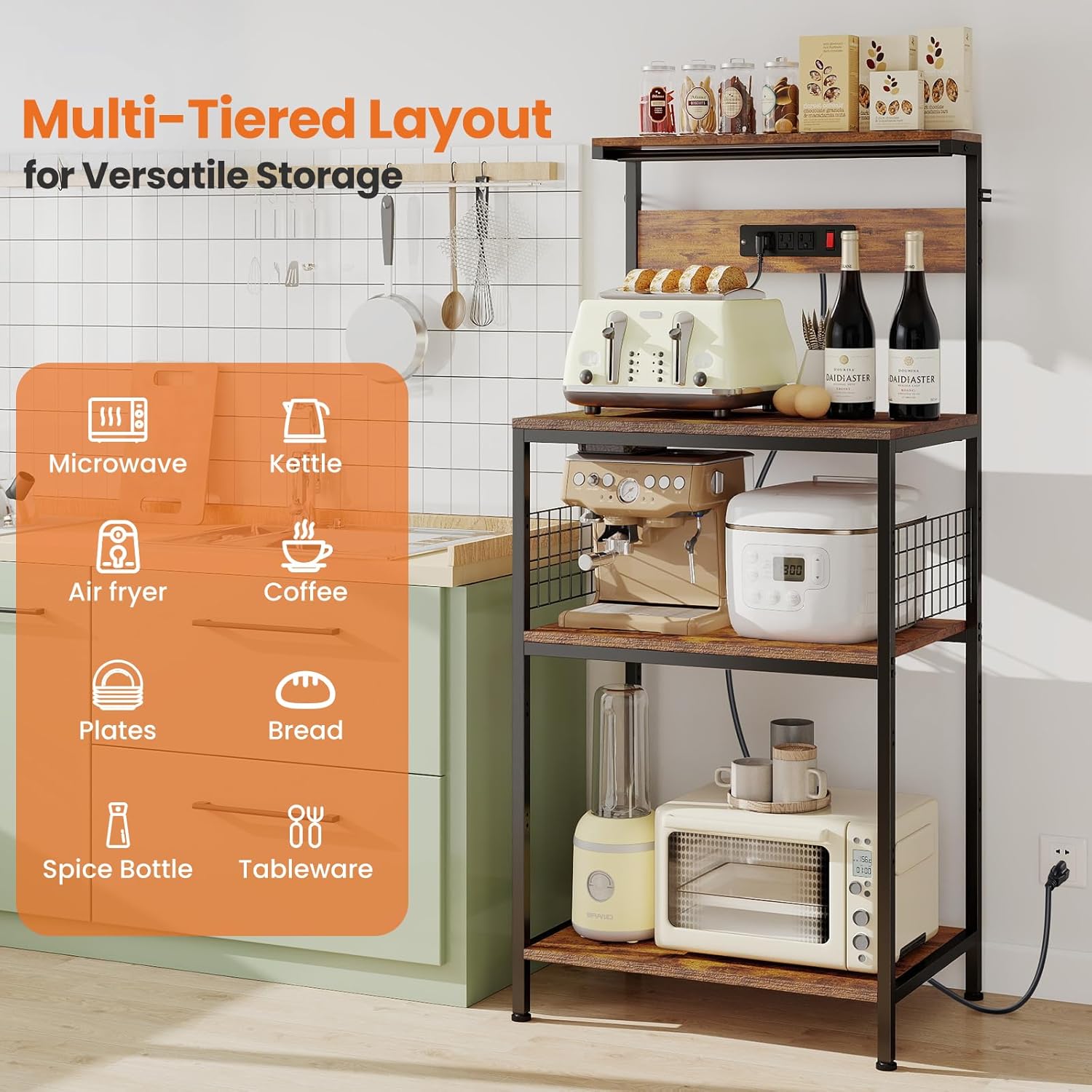【Built-In Power for Kitchen Convenience】No more messy cords or moving appliances around. This baker’s rack comes with 3 built-in outlets and a handy switch button—perfect for powering your coffee maker, toaster, or air fryer right where you need them.