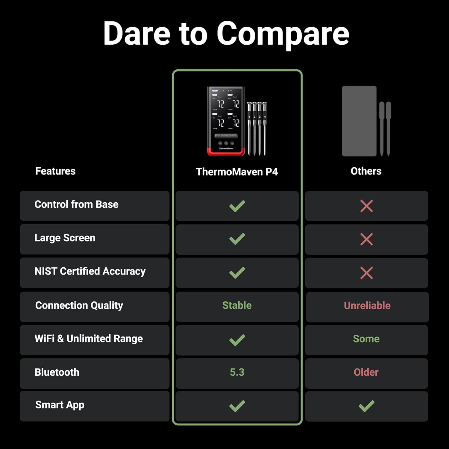 Unlimited Range via Wi-Fi: Many wireless thermometers are restricted to Bluetooth to connect your phone with the base, but the ThermoMaven P4 features advanced 2.4GHz Wi-Fi connectivity. This lets you monitor your culinary creations from anywhere.