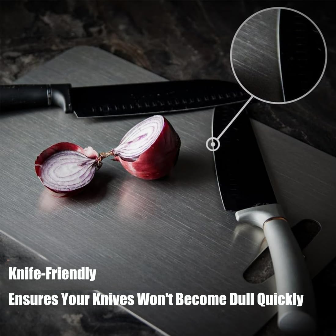 【Healthier and Safer】Our cutting boards are made of 100% pure titanium, which is a trusted material for surgical implants. Unlike wooden and plastic cutting boards, pure titanium cutting board do not absorb liquids, and are easy to clean,do not leave any odors or subtle food residues, making them a healthy choice for your kitchen