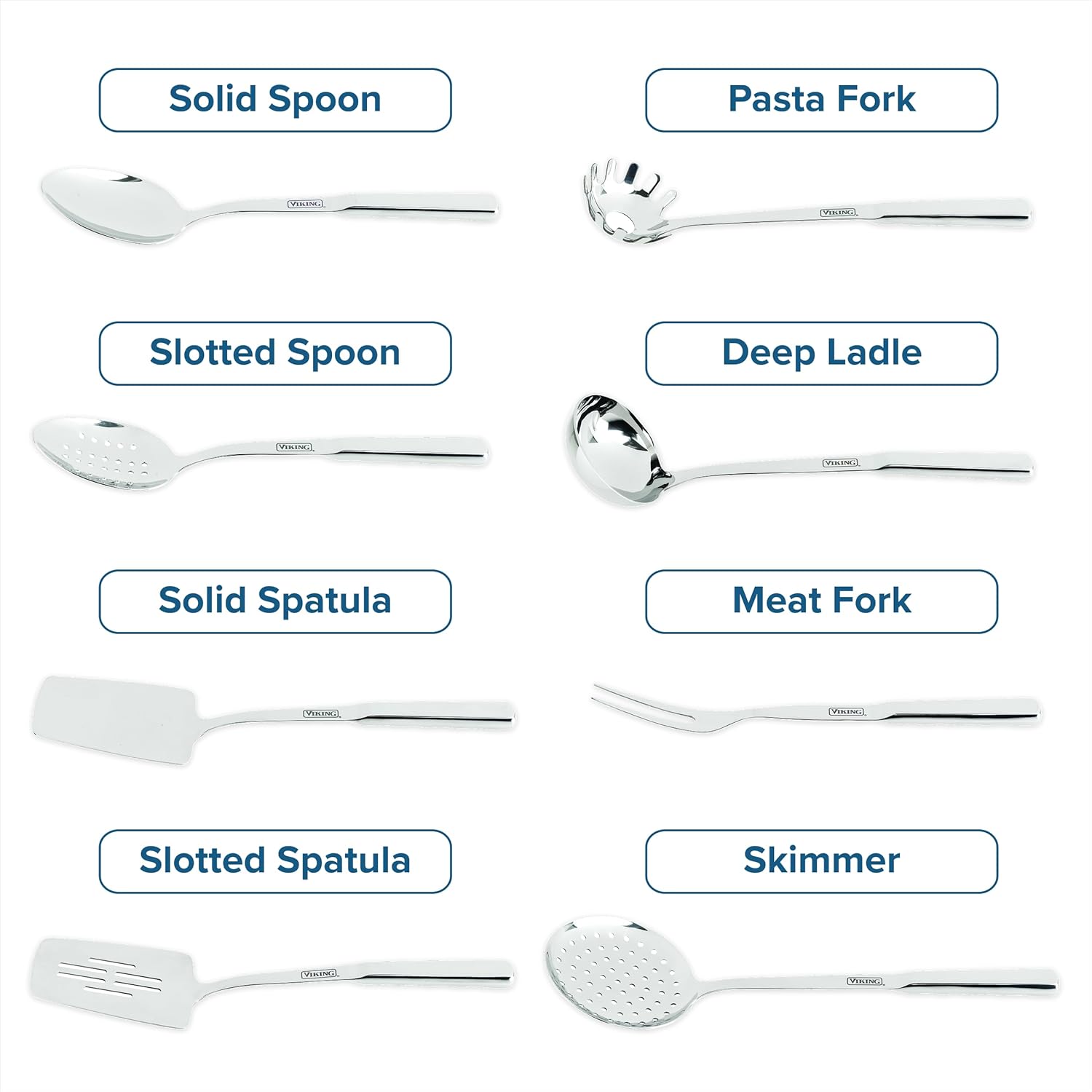 8 PIECE COOKING UTENSILS SET: Elevate your home culinary experience with the Viking 8 Piece Kitchen Supplies Set! Crafted with sleek long-lasting stainless steel, our kitchen accessories set includes (1) slotted spoon, (1) solid spoon, (1) slotted spatula, (1) solid spatula, (1) pasta fork, (1) deep ladle, (1) meat fork and (1) skimmer, offering a wide range of essential tools used by both novice and seasoned home chefs