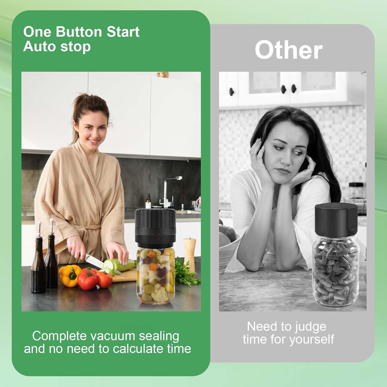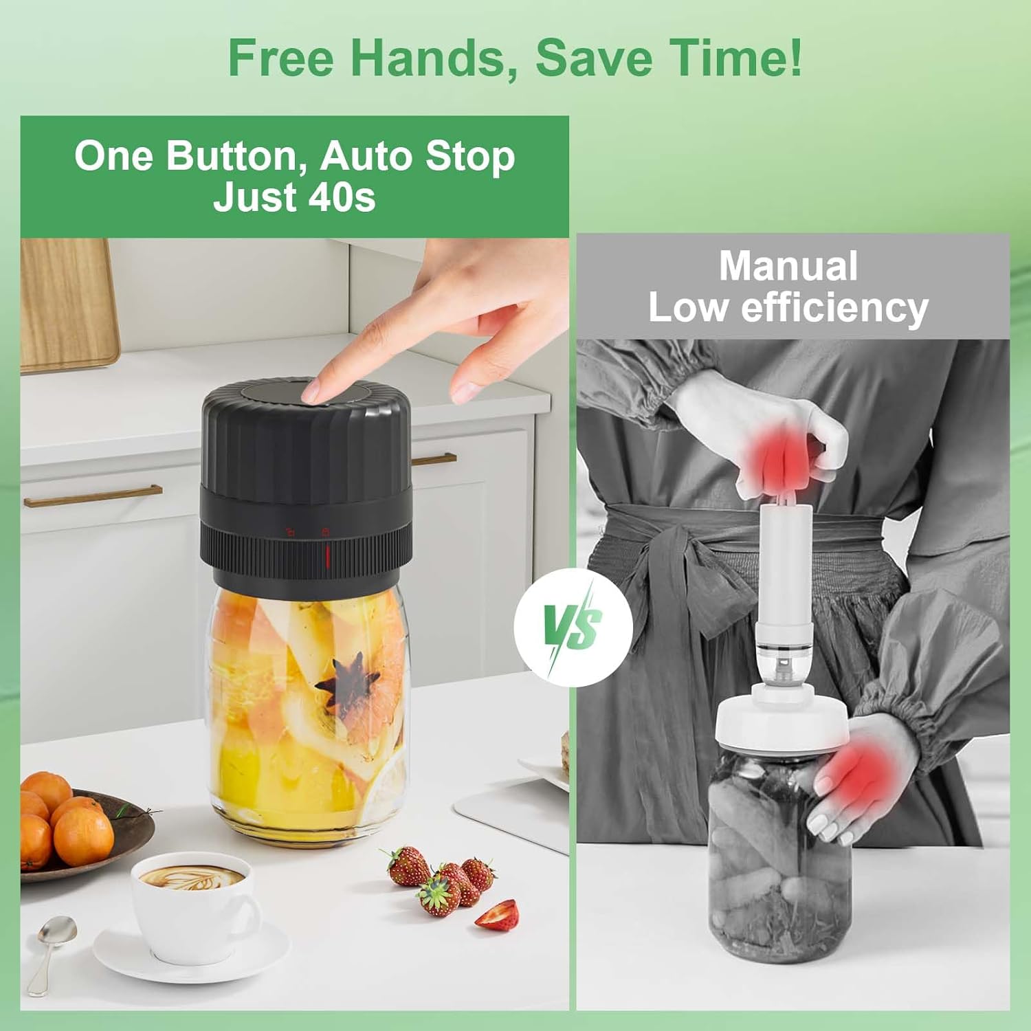 Save Time and Money: Our electric mason jar vacuum sealer empowers you to free up your hands, avoiding the trouble of using redundant accessory hoses. Achieve the perfect seal in just 20-40 seconds, ensuring ease and freshness in every jar, saving valuable time and effort, avoid food waste
