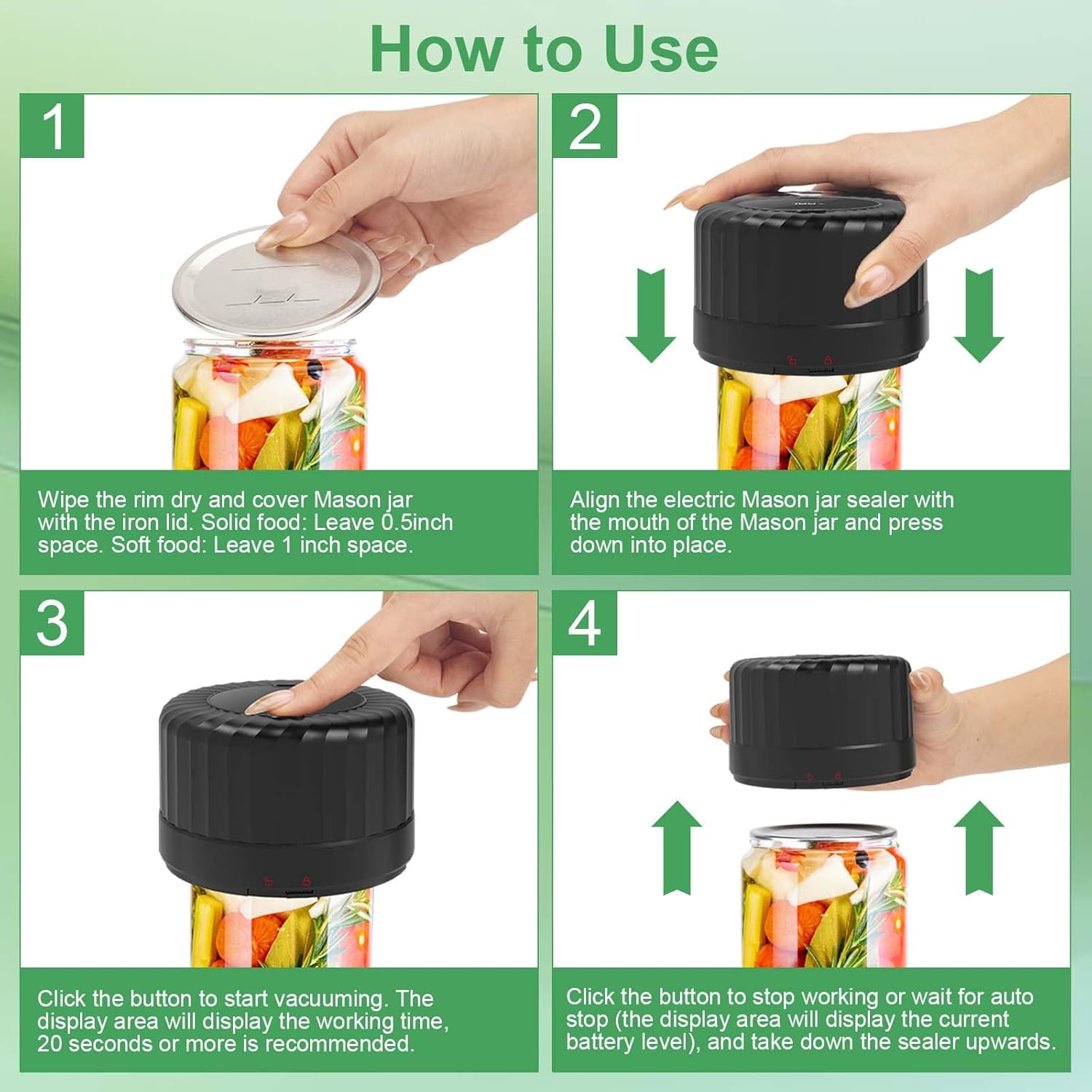 A Game Changer for Storing Products: SelePow electric mason jar vacuum sealer is a very handy kitchen tool for sealing jars. Compared to the hot water bath to seal or pressure cook, it simply requires a one-button start. You can make a lot of canning easily