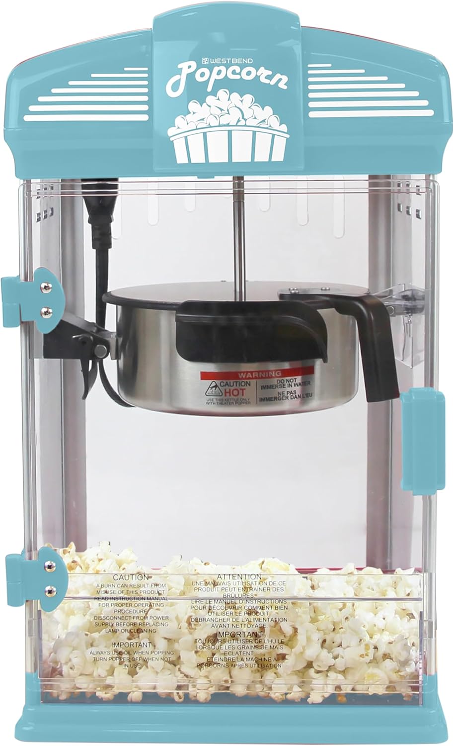 Premium Popcorn Machine Popcorn Kettle: Made of non-stick stainless steel, the removable stir-style popcorn kettle is easy to use and clean; Magnetic kettle cover attaches to the top of the machine for easy filling and emptying