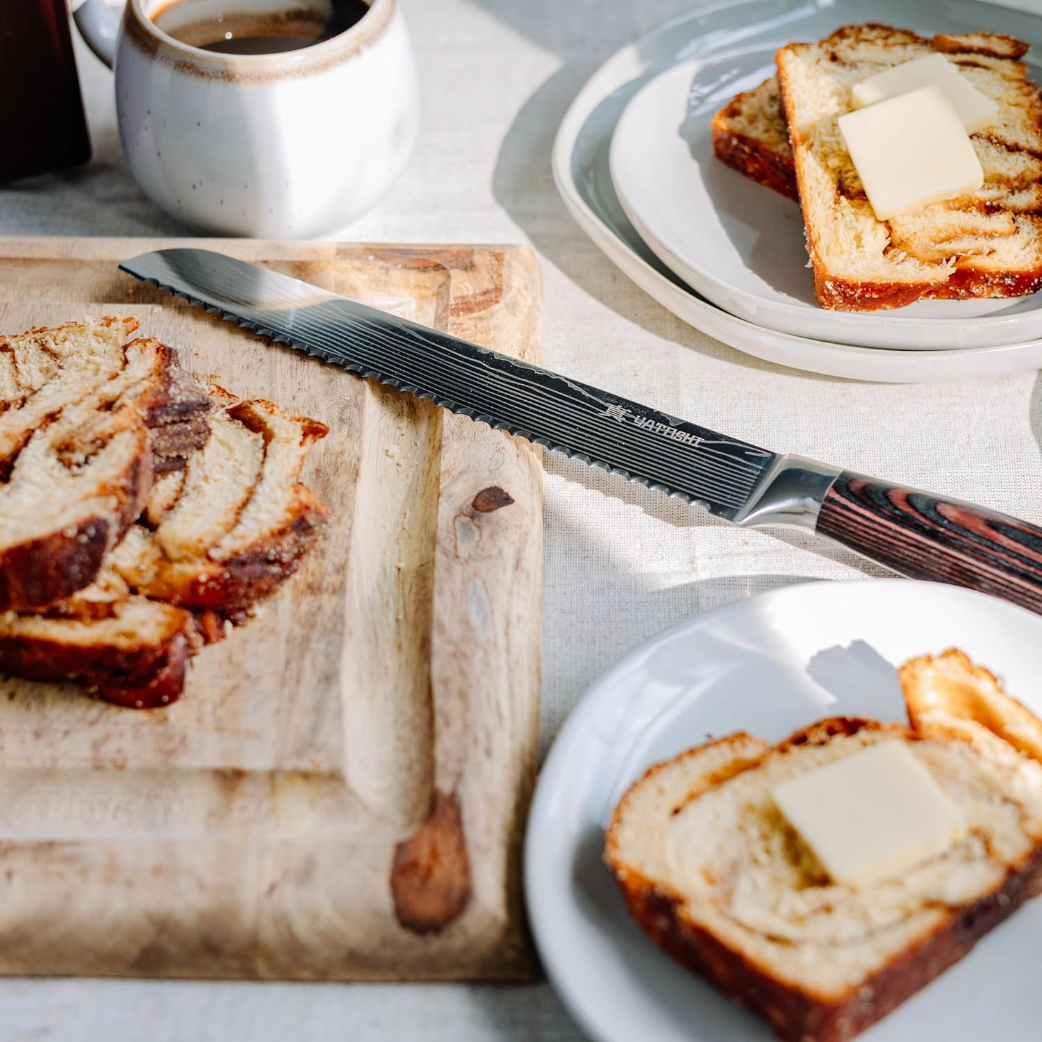 High Carbon Blades: Made with premium 7Cr17 High Carbon Steel that provides a razor-sharp professional quality blade. The steel contains 0.6-0.75 carbon, making it two times tougher than other knives in its class with a Rockwell Hardness of 57-58. Each blade is finished with an elegant waved pattern that adds a touch of artistry while highlighting its precision craftsmanship.