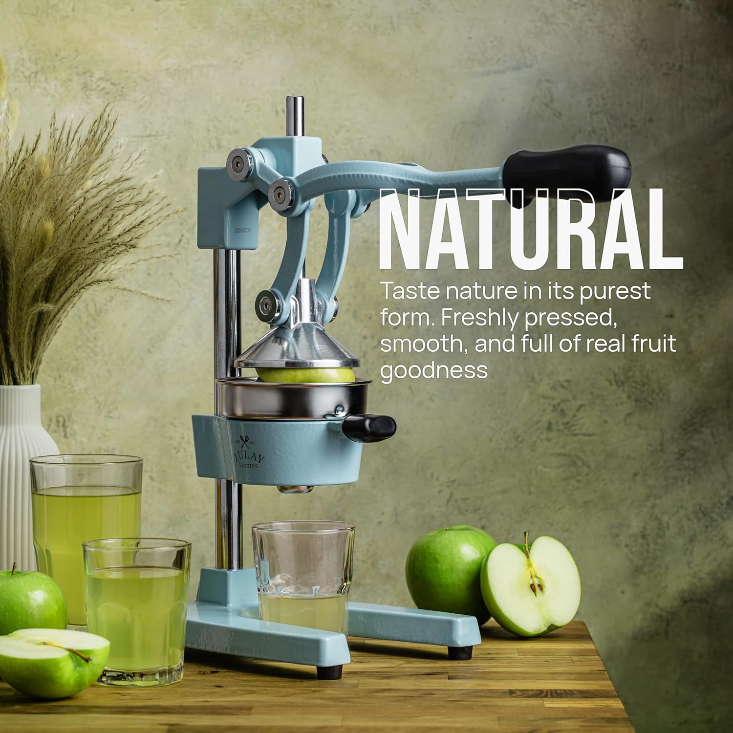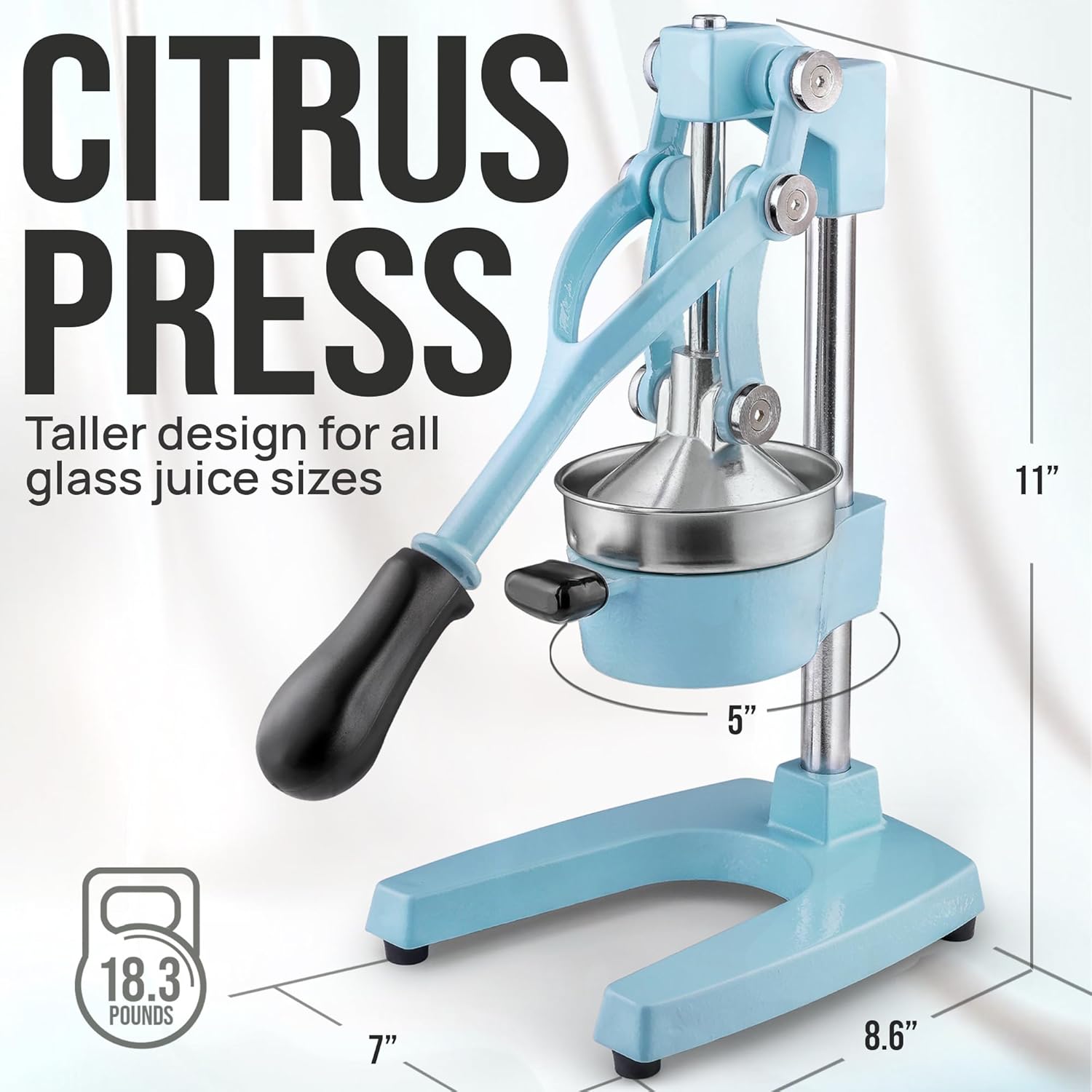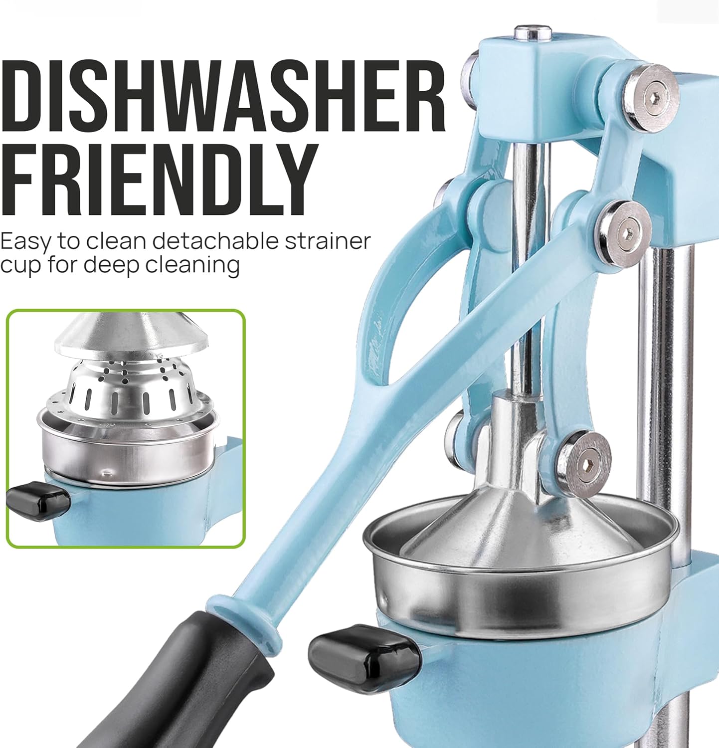 STURDY AND DURABLE MATERIAL: This manual juicer is made of heavy-duty cast iron that can easily withstand the pressure from continuous pressing for years to come. The leverage mechanism allows a one-time easy pull to get all the juice out. Our citrus press is designed with a heavy rubberized base to firmly keep it in place without the fear of falling, tipping, or sliding off the counter. This hand juicer is great for both professional and at-home use.